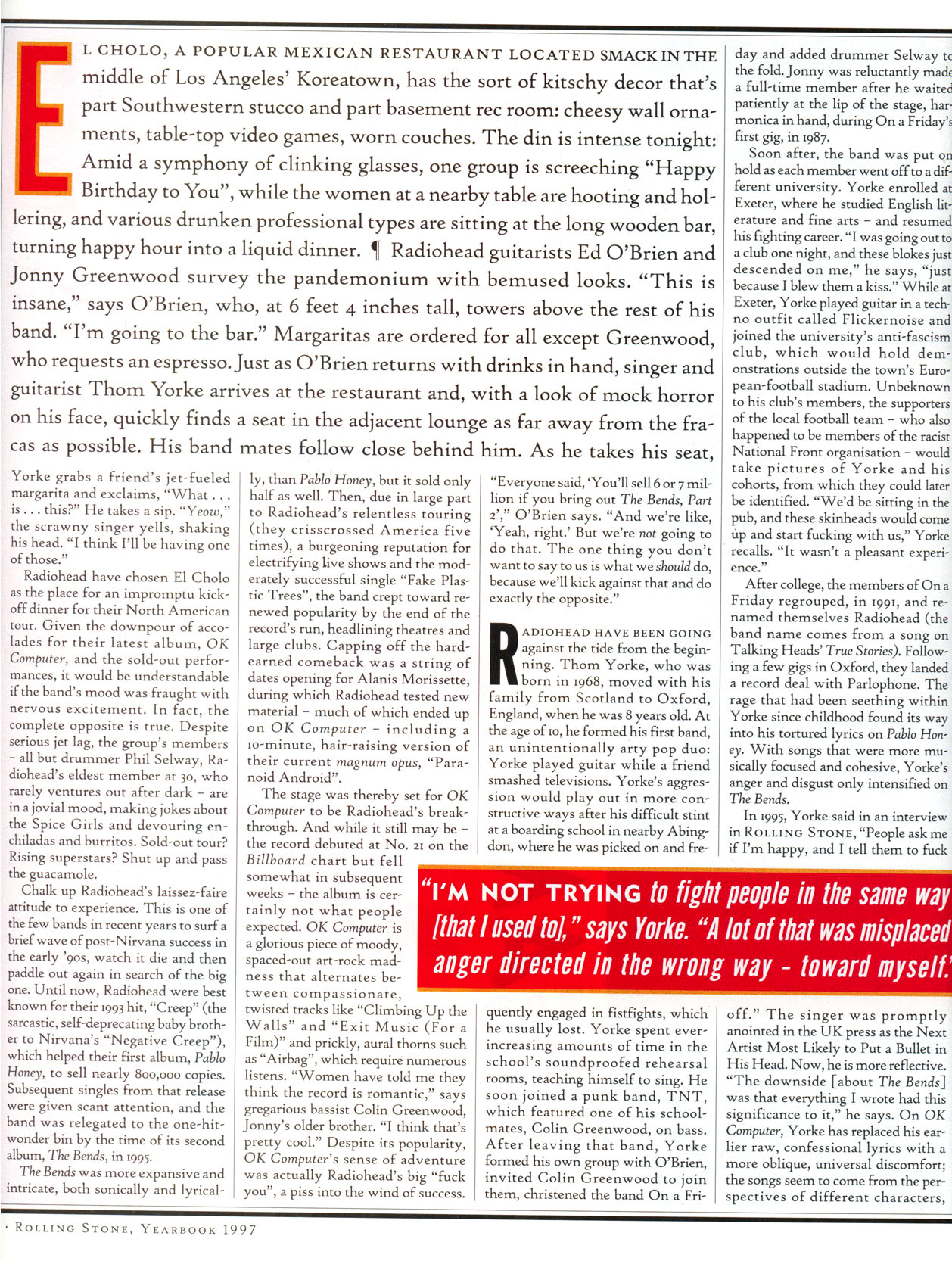 In 1995, Yorke said in an interview in ROLLING STONE, "People ask me if I'm happy, and I tell them to fuck off". The singer was promptly anointed in the U.K. press as the Next Artist Most Likely to Put a Bullet in His Head. Now, he is more reflective. "The downside [about The Bends] was that everything I wrote had this significance to it", he says. On OK Computer, Yorke has replaced his earlier raw, confessional lyrics with a more oblique, universal discomfort; the songs seem to come from the perspectives of different characters, who comment on society. "I'm not trying to fight people in the same way [that I used to]", he says. "A lot of that was misplaced anger directed in the wrong way - toward myself. You say all these things, and you realize that you're revealing things that you really shouldn't be saying to anybody, except the people you really, really love".