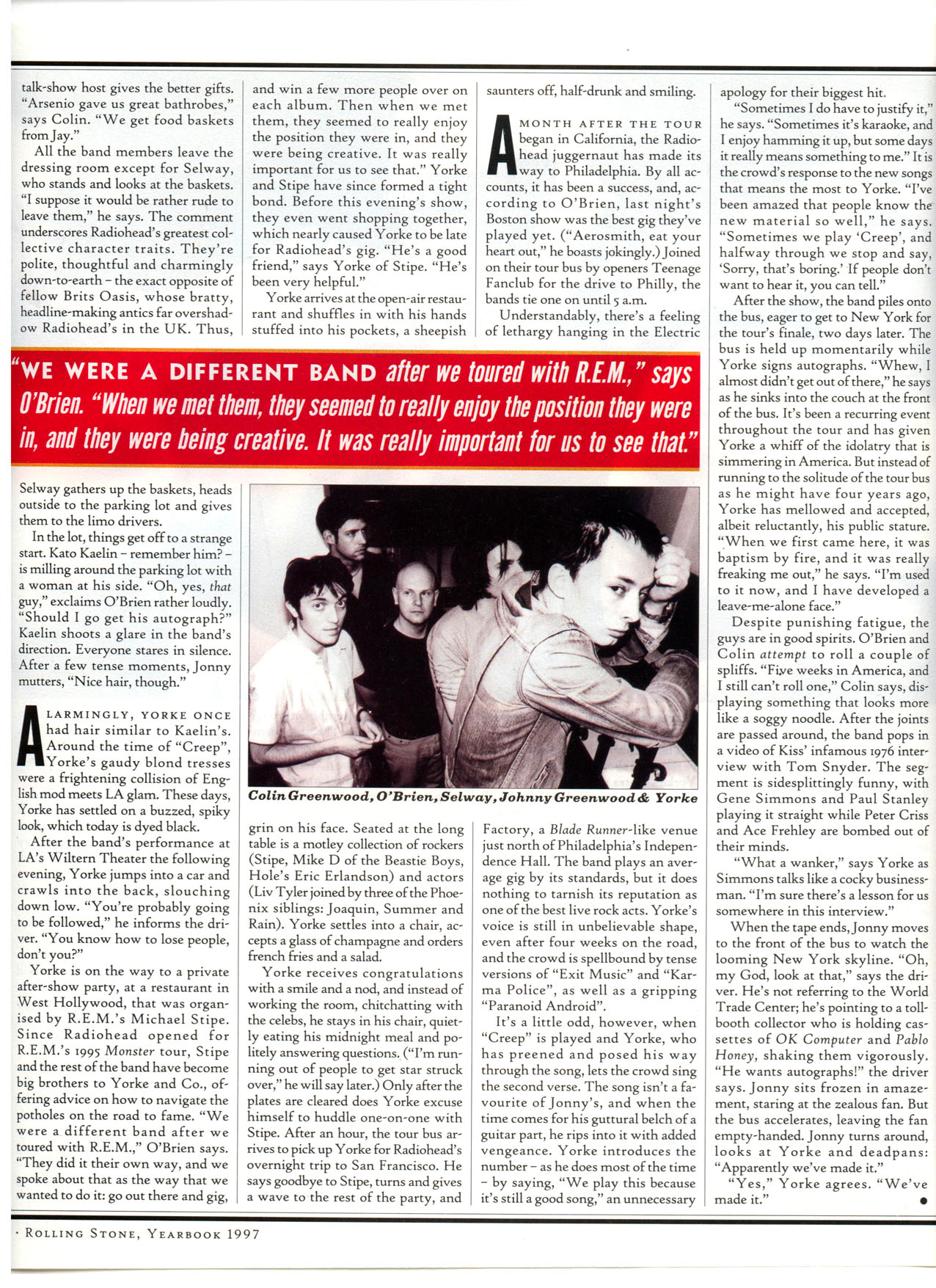 Yorke is on the way to a private after-show party, at a restaurant in West Hollywood, that was organized by R.E.M.'s Michael Stipe. Since Radiohead opened for R.E.M.'s 1995 Monster tour, Stipe and the rest of the band have become big brothers to Yorke and Co., offering advice on how to navigate the potholes on the road to fame."We were a different band after we toured with R.E.M.", O'Brien says. "They did it their own way, and we spoke about that as the way that we wanted to do it; go out there and gig, and win a few more people over on each album. Then when we met them, they really seemed to enjoy the position they were in, and they were being creative. It was really important for us to see that." Yorke and Stipe have since formed a tight bond. Before this evening's show, they even went shopping together, which nearly caused Yorke to be late for Radiohead's gig. "He's a good friend", says Yorke of Stipe. "He's been very helpful".