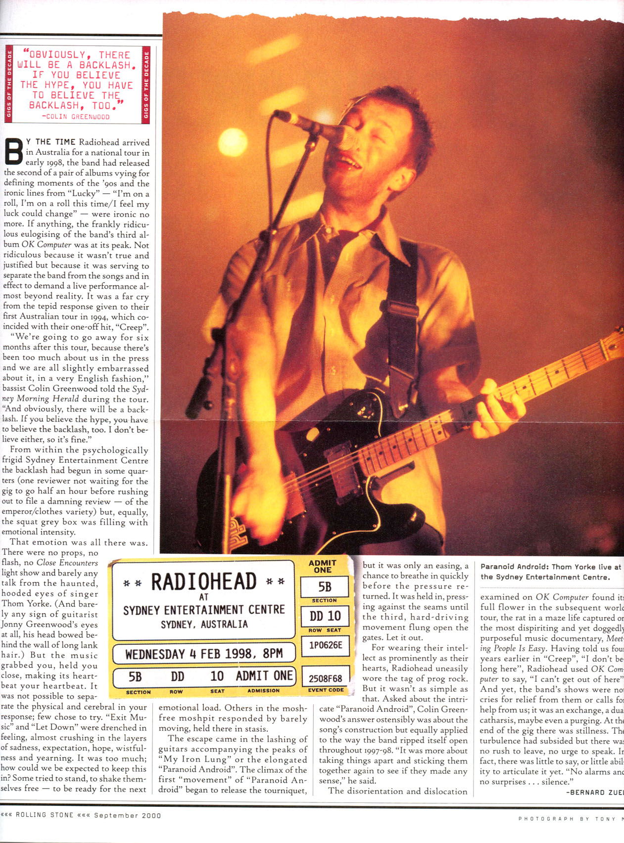 "We're going to go away for six months after this tour, because there's been too much about us in the press and we are all slightly embarrassed about it, in a very English fashion," bassist Colin Greenwood told the Sydney Morning Herald during the tour. “And obviously, there will be a backlash. If you believe the hype, you have to believe the backlash, too. I don't believe either, so it's fine."