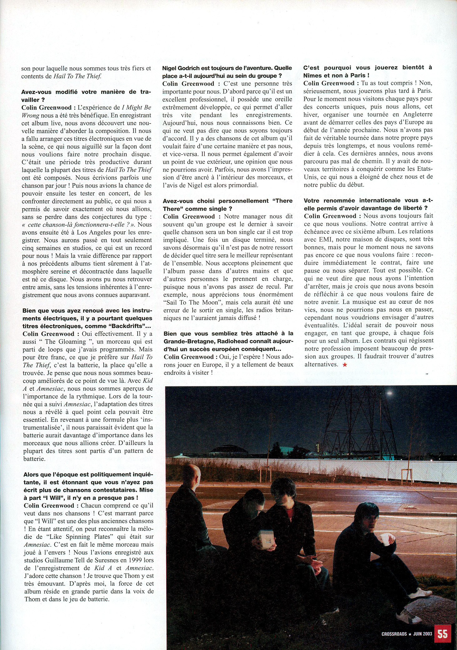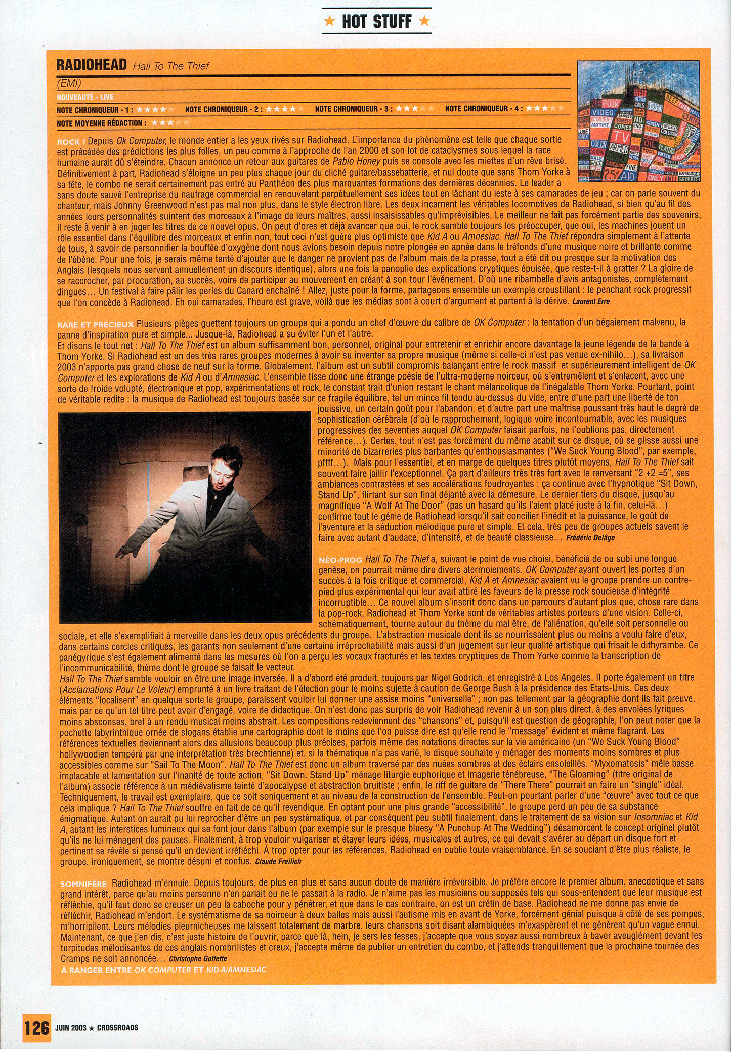 PEU DE GROUPES AURONT CONNU AUTANT DE SUCCÈS. TOUT LE MONDE S'ACCORDE À LE DIRE, MÉDIAS, MUSICIENS ET CRITIQUES, RADIOHEAD EST AUJOURD'HUI INCONTOURNABLE. AVEC HAIL TO THE THIEF, LEUR SIXIÈME OPUS, THOM YORKE ET SA BANDE S'IMPOSENT DÉSORMAIS COMME LES HÉROS D'UN DE NOS NOUVEAUX MYTHES MODERNES.