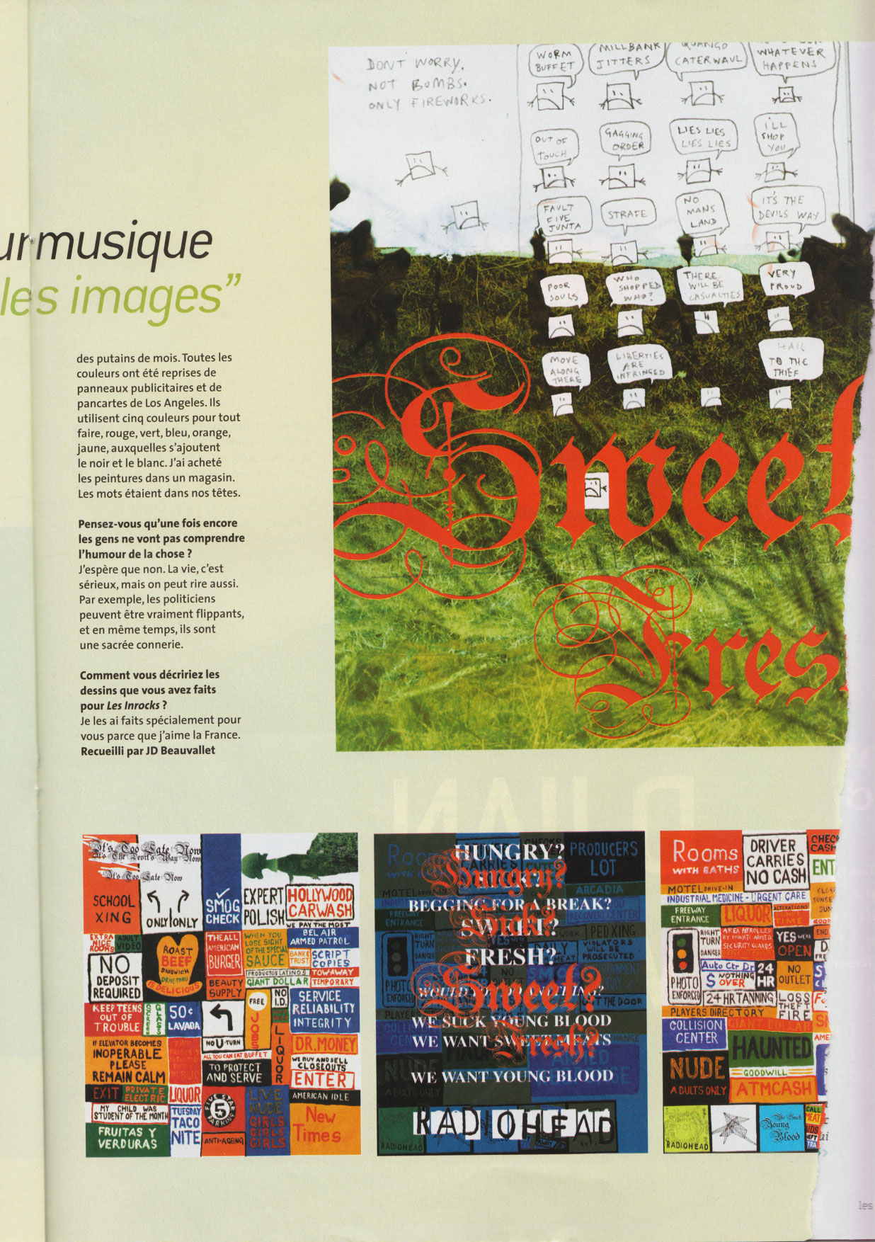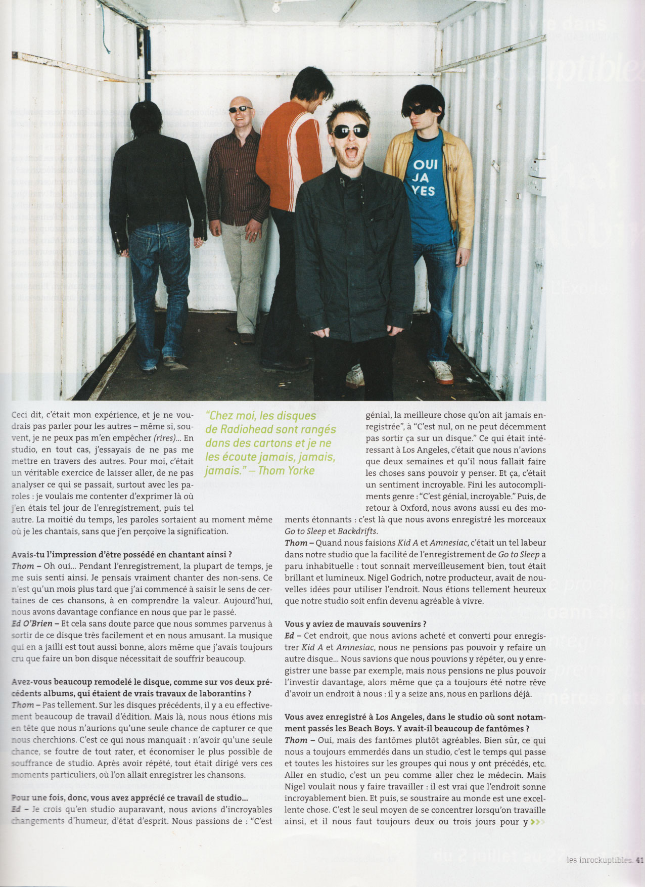 Ceci dit, c'était mon expérience, et je ne voudrais pas parler pour les autres - même si, souvent, je ne peux pas m'en empêcher (rires)... En studio, en tout cas, j'essayais de ne pas me mettre en travers des autres. Pour moi, c'était un véritable exercice de laisser aller, de ne pas analyser ce qui se passait, surtout avec les paroles : je voulais me contenter d’exprimer là où ; en étais tel jour de l'enregistrement, puis tel autre. La moitié du temps, les paroles sortaient au moment même où je les chantais, sans que j'en perçoive la signification. Avais-tu l’impression d’être possédé en chantant ainsi ? Thom - Oh oui... Pendant l'enregistrement, la plupart de temps, je me suis senti ainsi. Je pensais vraiment chanter des non-sens. Ce r est qu'un mois plus tard que j’ai commencé à saisir le sens de certaines de ces chansons, à en comprendre la valeur. Aujourd'hui, r.ous avons davantage confiance en nous que par le passé. Ed O’Brien - Et cela sans doute parce que nous sommes parvenus à i ortir de ce disque très facilement et en nous amusant. La musique qui en a jailli est tout aussi bonne, alors même que j'avais toujours :ru que faire un bon disque nécessitait de souffrir beaucoup. Avez-vous beaucoup remodelé le disque, comme sur vos deux précédents albums, qui étaient de vrais travaux de laborantins ? Thom - Pas tellement. Sur les disques précédents, il y a eu effective-ment beaucoup de travail d'édition. Mais là, nous nous étions mis r: tête que nous n’aurions qu'une seule chance de capturer ce que r. rus cherchions. C’est ce qui nous manquait : n'avoir qu'une seule chance, se foutre de tout rater, et économiser le plus possible de 5 : -ffrance de studio. Après avoir répété, tout était dirigé vers ces - : ments particuliers, où l'on allait enregistrer les chansons. Pour une fois, donc, vous avez apprécié ce travail de studio... Ed - Je crois qu'en studio auparavant, nous avions d'incroyables chargements d’humeur, d'état d'esprit. Nous passions de : "C'est génial, la meilleure chose qu’on ait jamais enregistrée”, à "C’est nul, on ne peut décemment pas sortir ça sur un disque.” Ce qui était intéressant à Los Angeles, c'était que nous n'avions que deux semaines et qu’il nous fallait faire les choses sans pouvoir y penser. Et ça, c'était un sentiment incroyable. Fini les autocompliments genre : "C'est génial, incroyable.” Puis, de retour à Oxford, nous avons aussi eu des moments étonnants : c’est là que nous avons enregistré les morceaux Go to SIeep et Backdrifts. Thom - Quand nous faisions Kid A et Amnesiac, c'était un tel labeur dans notre studio que la facilité de l’enregistrement de Go to Sleep a paru inhabituelle : tout sonnait merveilleusement bien, tout était brillant et lumineux. Nigel Godrich, notre producteur, avait de nouvelles idées pour utiliser l'endroit. Nous étions tellement heureux que notre studio soit enfin devenu agréable à vivre. Vous y aviez de mauvais souvenirs ? Ed - Cet endroit, que nous avions acheté et converti pour enregistrer Kid A et Amnesiac, nous ne pensions pas pouvoir y refaire un autre disque... Nous savions que nous pouvions y répéter, ou y enregistrer une basse par exemple, mais nous pensions ne plus pouvoir l'investir davantage, alors même que ça a toujours été notre rêve d'avoir un endroit à nous : il y a seize ans, nous en parlions déjà. Vous avez enregistré à Los Angeles, dans le studio où sont notamment passés les Beach Boys. Y avait-il beaucoup de fantômes ? Thom - Oui, mais des fantômes plutôt agréables. Bien sùr, ce qui nous a toujours emmerdés dans un studio, c’est le temps qui passe et toutes les histoires sur les groupes qui nous y ont précédés, etc. Aller en studio, c'est un peu comme aller chez le médecin. Mais Nigel voulait nous y faire travailler : il est vrai que l'endroit sonne incroyablement bien. Et puis, se soustraire au monde est une excellente chose. C'est le seul moyen de se concentrer lorsqu'on travaille ainsi, et il nous faut toujours deux ou trois jours pour y parvenir. Voilà qui donne l'impression que nous travaillons comme des acteurs à méthode... D'ailleurs, c'est ainsi que Nigel a tendance à nous qualifier et ce n'est pas faux : pour travailler comme nous, il faut pouvoir s'endormir et se réveiller avec le travail en tête, et tout le reste doit devenir comme une zone grisée, lointaine. Ed - Nous avons choisi de ne pas vivre complètement dans des bulles, de continuer à être humains. Mais, pour enregistrer, il faut se soustraire à cette réalité, ne plus avoir à se demander s’il faut sortir la poubelle, s'occuper de la cuisine... D'autant plus qu'il y a désormais beaucoup de pères dans le groupe, et que nous avons besoin d'être en dehors de nos familles pour travailler. Du coup, à la fin des enregistrements, nous sommes complètement ailleurs. Ce changement de vie et d'atmosphère a-t-il causé des problèmes ? Thom - A la fin des enregistrements, je me suis complètement gelé, j’étais paralysé. J'ignore ce qui m'est arrivé, je pouvais à peine rentrer à l’hôtel, j'avais l'impression que la voiture se conduisait toute seule. Chacun de mes os me faisait mal, je ne pouvais rien faire, même pas téléphoner. Je luttais pour que mon corps ne se paralyse pas. Ça ne m'était jamais arrivé de manière aussi extrême et je crois que c’était à cause de ce travail constant, sans aucune pause. Hail to the Thief était pressenti comme un album pop, en tout cas par vos fans les plus militants. Est-ce ainsi que vous le décririez ? Thom - Nous avons beaucoup joué ces chansons en concert, avant que les gens ne puissent les écouter sur disque et c’est vrai que. dans un tel contexte, les morceaux peuvent paraître plus simples, avec des guitares en avant. Bien sûr, du point de vue de l'enregistrement, ça a été un disque assez simple à faire, avec beaucoup de guitares. Même