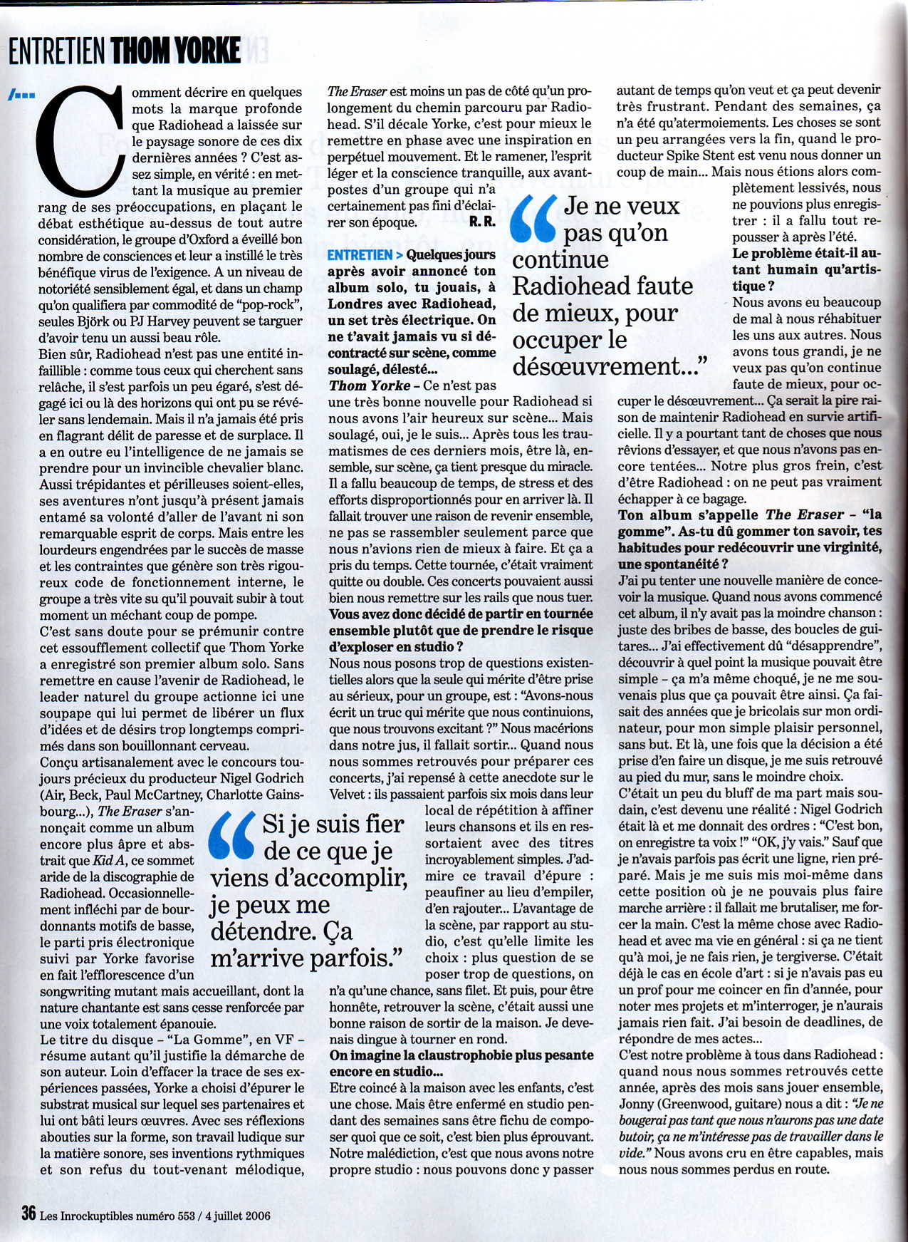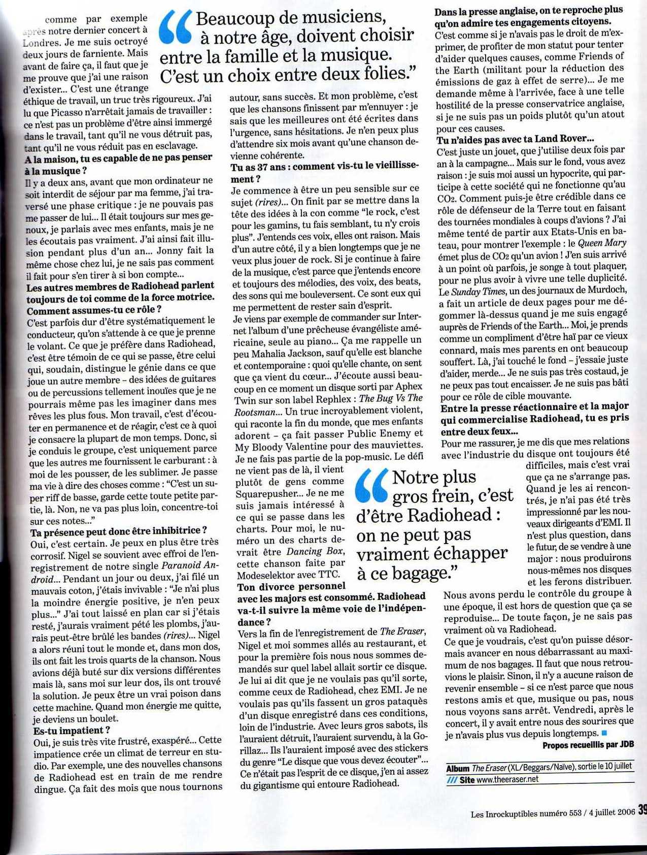 Near the end of recording The Eraser, Nigel & I went to a restaurant, & for the first time we asked ourselves on what label will we release the album on. I told him I didn’t want to go back to EMI. I didn’t want them to do a huge deal over the recording conditions, far from the industry. With their Big Boots, they would have destroyed it, would have oversold it, the Gorrilaz way... They would have put stickers on it saying: “The album you need to listen to”... It wasn’t the spirit of the disc, ive had enough of this gigantism that surrounds RH.