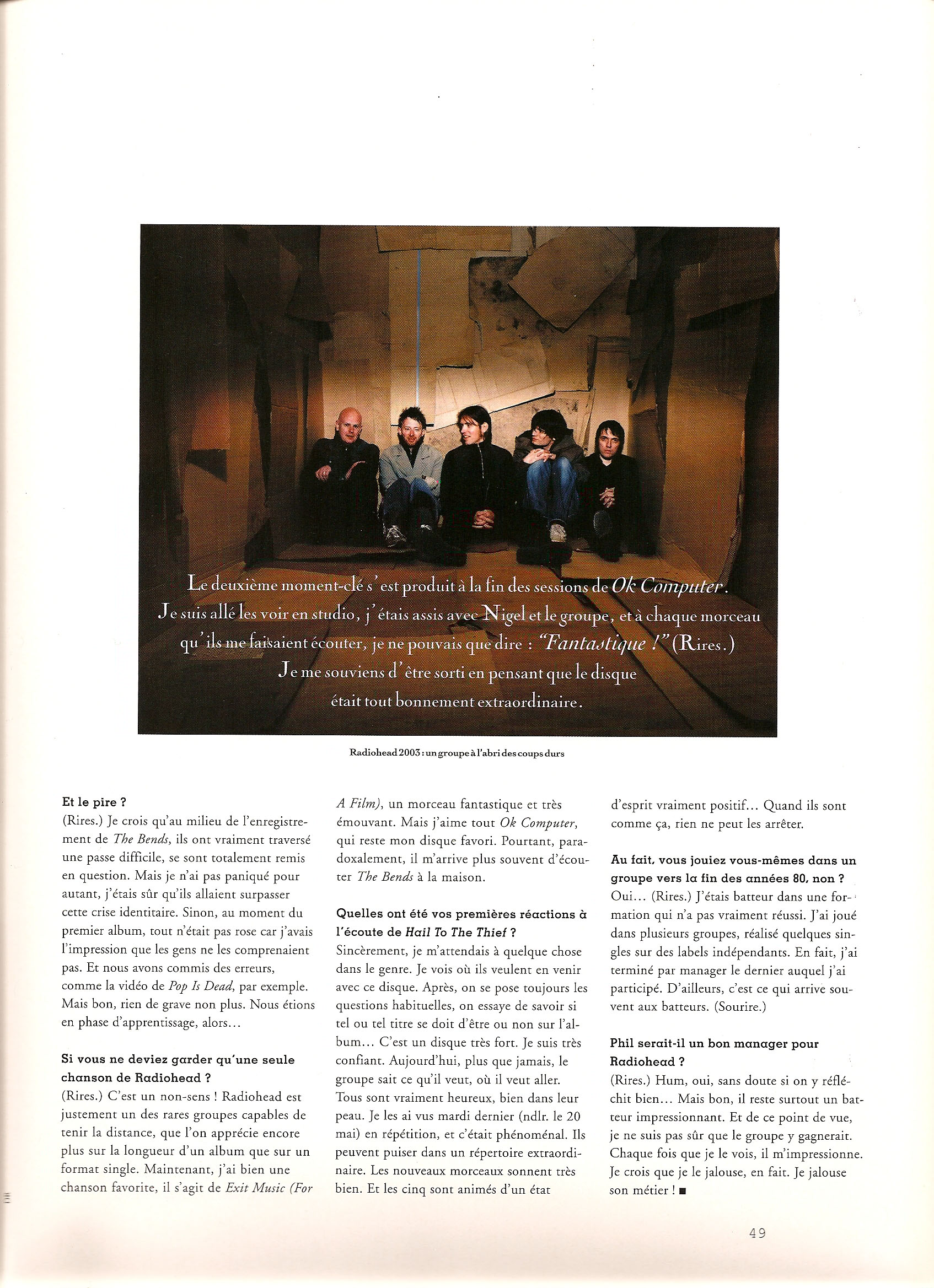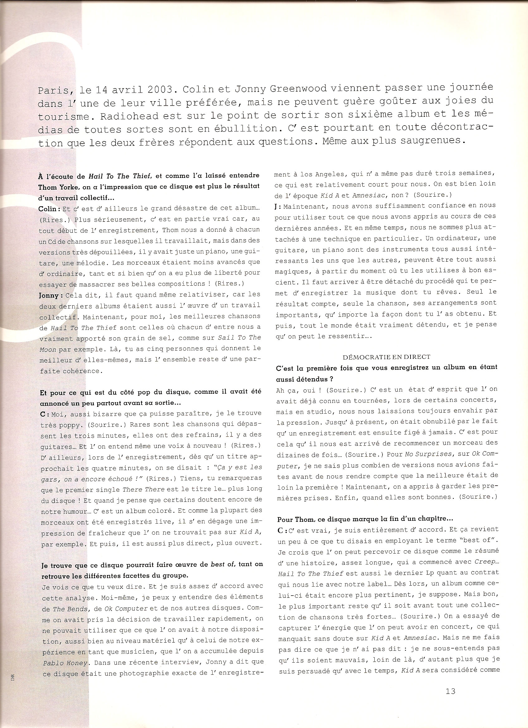 Oxford, 9 avril 2003. Dans un hôtel coquet et discret, Radiohead se plie de bonne grâce aux tourments de la promotion. Pour la première fois depuis Ok Computer, son leader Thom Yorke a même accepté de parler à nouveau à la presse spécialisée, après le mutisme qui avait accompagné les sorties de Kid A et Amnesiac. Détendu, souriant, dévoilant un humour dont seuls ses proches avaient pu profiter j usqu' ici, il évoque la sérénité et la confiance d7 un groupe qui lui ont permis d' enregistrer Hail To The Thief, disque fascinant, entre apaisements oniriques et tensions orgasmiques, point d' orgue d' une discographie guidée par un seul mot d7 ordre : l7 excellence.