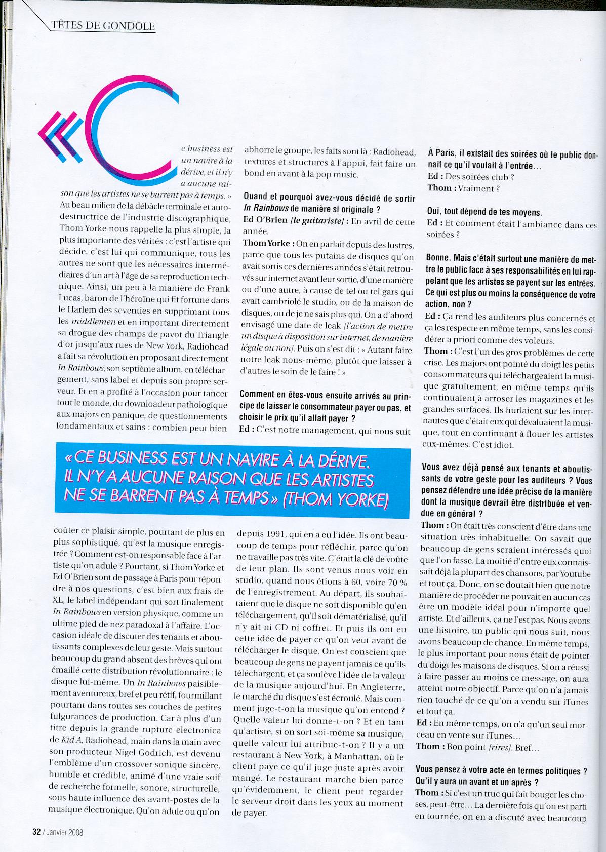 Thom : If it makes things change, then maybe ... Last time we went on tour, we talked with a lot of other bands that urge us on doing it. You must fuck up things a bit when you have an opportunity. But mostly we did it because we feel it was the most obvious thing to do : release our stuff as quickly as possible, as we knew that so many people were eager to listen to it. If we raise the good question at the same time, that’s also very good. There’s so many business _ in big letters _ in the music industry, and this business is like a drift boat. There’s no reason for artists not to go away when it’s still time. Why shoud we answer to the shareholders? Why whould we answer to investment funds speculators?