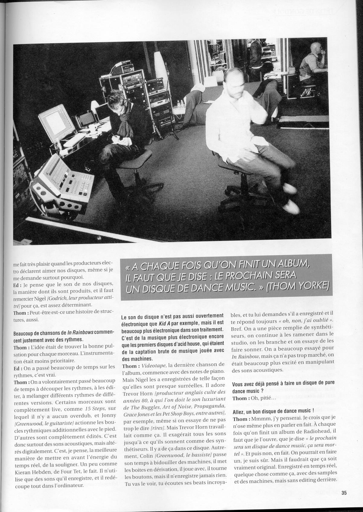 Thom : I’ll think about it. Actually, I don’t dare to talk about it anymore. Each time we finish an album, I have to open my mouth to say «next album will be a dance music one, it’ll be great». Then, finally, it’s not. We could make one, I’m sure. But it would have to be really original. Sort of recorded live, with samples and machines, but without editing afterwards. And if you screw up something, you do it all again. We love Hank Shocklee and the Bomb Squad, Public Enemy’s producers. The way they install a set-up in order to be able to play completely live...