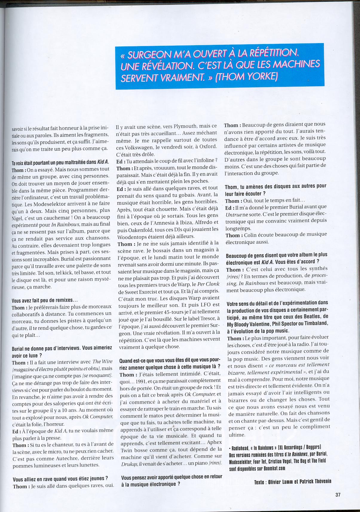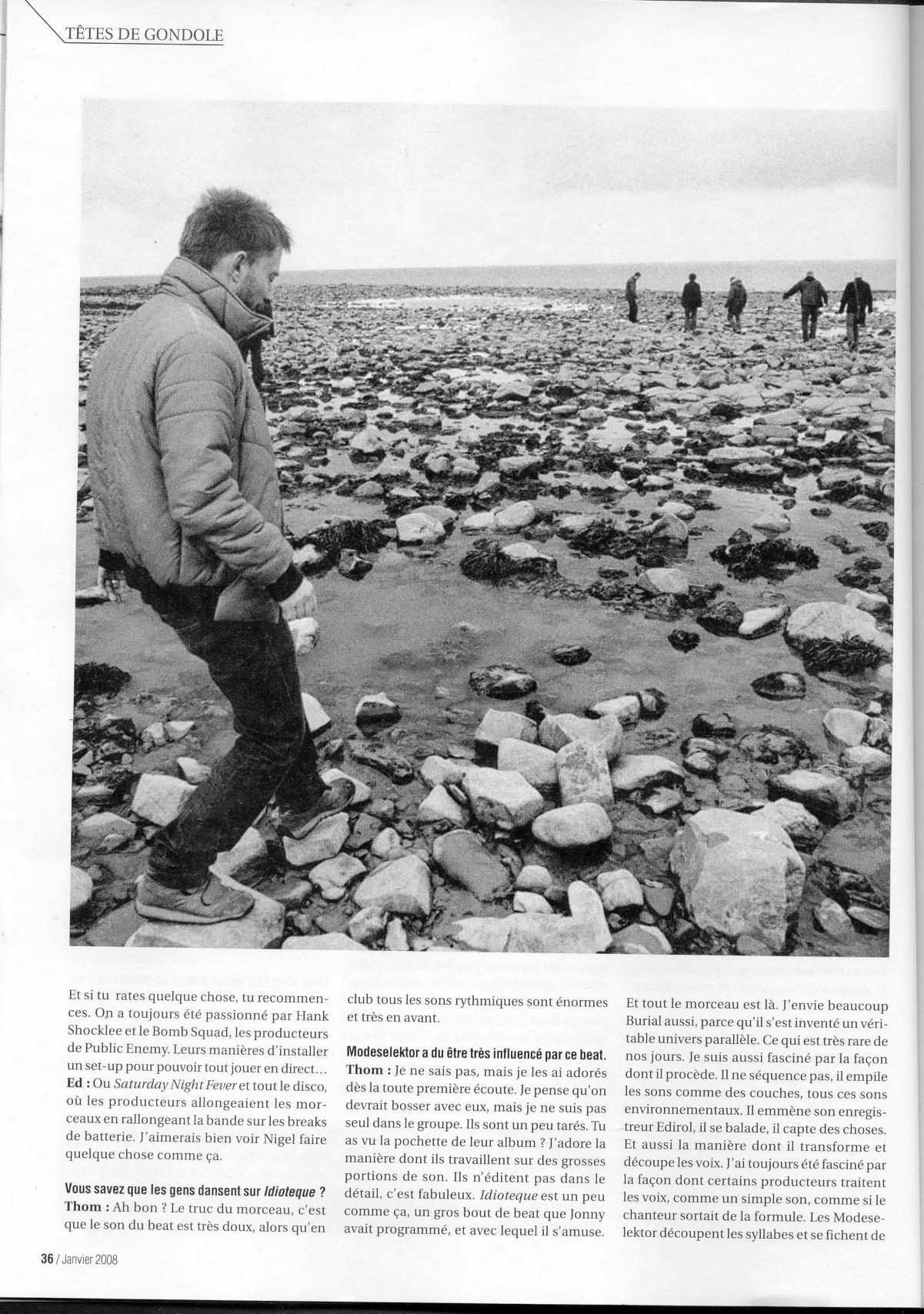 Thom : I don’t know, but I’ve always loved them, from the very first listen. I think we should work with them but I’m not alone in the band. They’re a bit crazy. Did you see the jacket of their last album ? I love the way they work on big portion of sound, they edit roughly, it’s amazing. Idioteque is a bit like that, a large piece of beat that Jonny programmed and with which he played. And everything in the track is there. I also envy Burial a lot, because he’s made himself his own universe. Which is very rare nowadays. I’m fascinated by the way he proceeds. He doesn’t sequence, he piles up sounds like layers, environmental sounds. He takes his recorder Edirol, he goes for a walk, he captures things. And the way he transforms and cut up voices. I’ve always been fascinated by the way some producers process voices, like a mere sound as if the singer was not part of it. Modeselektor cut up syllabes and don’t care for how the outcome does justice to the initial take or the lyrics. They love fragments, sounds they produce, and that’s all. I wish I would be treated more like that.