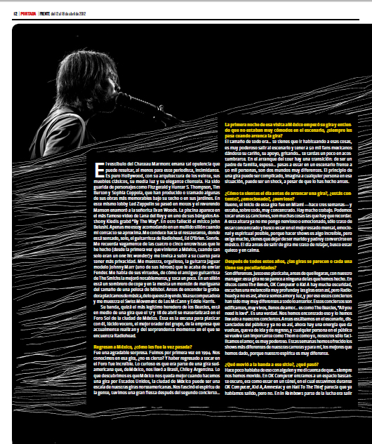 Ed: Sí, es para sorprender a los fans. Pero también es consecuencia de que es agradable ir redescubriendo canciones, viendo cuáles se sienten bien. Somos una banda afortunada, tenemos un gran acervo de canciones, no tenemos que tocar “Fake Plastic Trees”, no tenemos que tocar “Creep” o “Paranoid Android” o “No Surprises”. Yo creo que a la gente a la que le gusta Radiohead entiende —a estas alturas ya debe haber entendido el mensaje— que tocamos lo que sentimos apropiado, que no los vamos a engañar, que no les vamos a decir que es EL SHOW DE RADIO HEAD DE GR ANDES ÉXITOS . Cuando vayamos a la ciudad de México eso les ofreceremos. Es bueno, es honesto, es real.