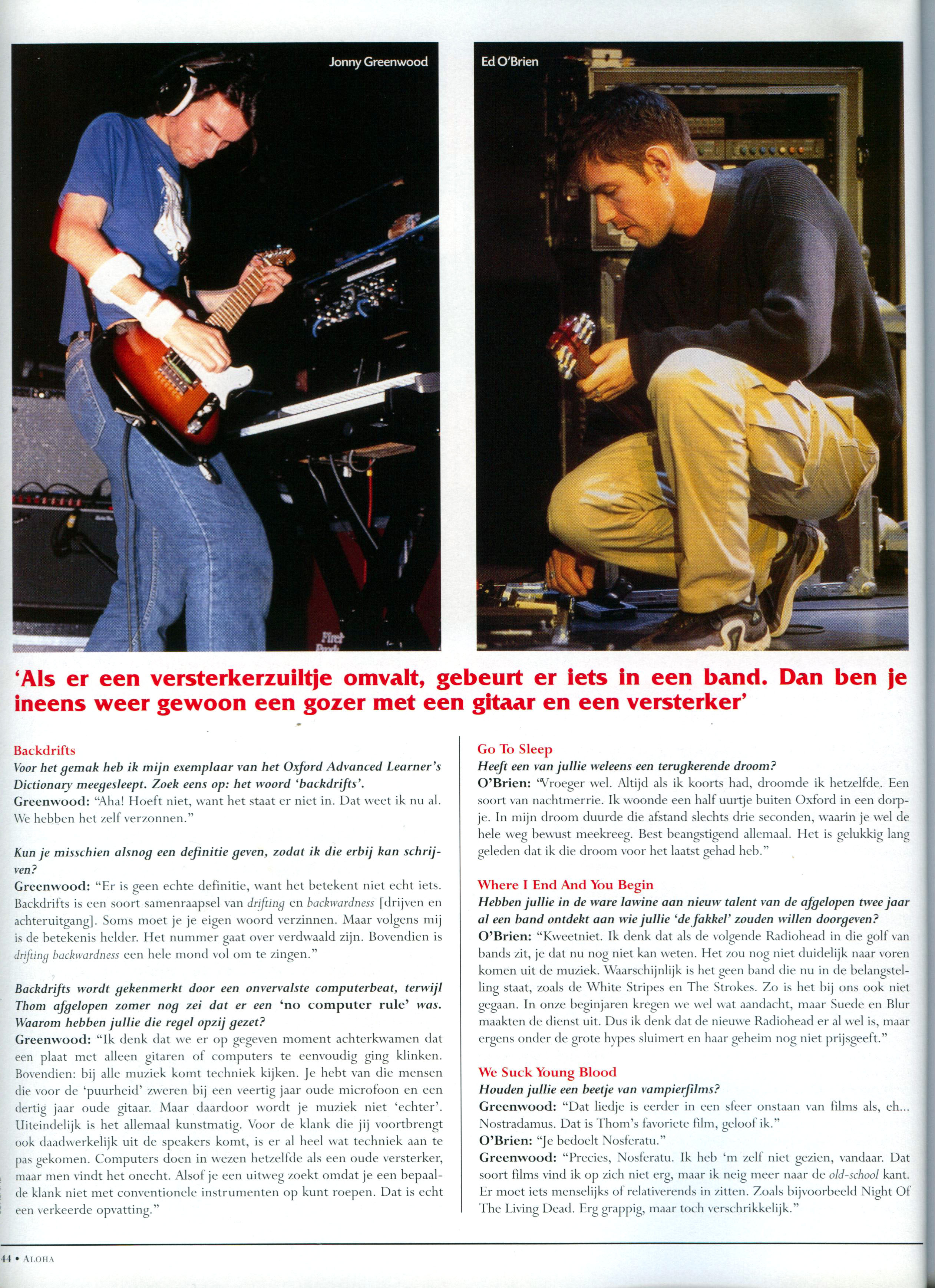 Een nieuwe plaat van radiohead gaat altijd gepaard met een boel gezwets, gezeur en gezever. Als het al niet op de plaat zelf staat, dan gebeurt het wel in de aanloop naar de release. De mastertapes van Hail To The Thief, de zesde langspeler van het illustere kwintet uit Oxford, waren nog niet koud uit de studio of de hele plaat stond al op internet. Voor een band die graag een waas van geheimzinnigheid om zich heen creëert, is dat behoorlijk balen. De frustraties werden dan ook breed uitgemeten in de Britse muziekpers. Diezelfde muziekpers was er dit keer nu eens niet de schuld van dat een album vroegtijdig uidekte: het spoor loopt waarschijnlijk naar een van de medewerkers van de Engelse studio waar Radiohead Hail To The Thief afmixte. Daar had de platenmaatschappij niet op gerekend toen de extreme beveiligingsmaatregelen voor het journaille bedacht werden. Elke journalist die vroegtijdig een exemplaar wenst te ontvangen, krijgt een op naam gewatermerkt schijfje opgestuurd. Zo ook uw' reporter. Als nog voor de release muziek zou worden gevonden die van kopie nummer 488/Aloha/Willem Bemboom/Holland afkomstig is, dan komt mij dat op een boete te staan die kan oplopen tot 25.000 euro. Dus als ik Hail To The Thief daags voor het interview in handen krijg (veiligheidsvoorschriften), gaat hij linea recta van het hoesje naar de discman naar een veilige plek ergens in mijn flatje. Scheelt weer een jaartje of twee w erken. Door al deze perikelen zou je haast vergeten dat er ook nog geïnterviewd moet worden, en wel de volgende ochtend om half elf. Zanger Thom Yorke ontbreekt, gitaristen Jonny Greenwood en Ed 0’Brien zijn wel inpandig in een statig hotel op de zuidpunt van de Amsterdamse Rosse Buurt. Als ik Greenwoods suite betreed, zit O’Brien nog in de ontbijtzaal. Greenwood zelf blijkt net wakker, wat te merken is aan zijn eerste woorden over het hoe en wat van Hail To The Thief. “September... Los Angeles... opnamen... I suppose mwghmmbl... zonneschijn... ander klimaat.” Gevolgd door: “Afronden... gewoon thuis in Oxford... mwghmmbl leaked out... vond je ‘m leuk?” Leuk. Da’s toch wel de laatste beschrijving waaraan Hail To The Thief voldoet. Boeiend is beter. Op sommige momenten bijzonder helder en grijpbaar, dan weer donkerder dan de twee vorige platen bij elkaar. Laten we zeggen dat Radiohead op deze plaat mooi laveert tussen de ingenieuze rock-sound van de meesterwerken The Bends (‘95) en OK Computer (’97) en het zijn-tijd-ver-vooruit-geëxperimenteer op Kid A (’OO) en Amnesiac (’Ol). Tegen Jonny Greenwood zeg ik gewoon: “Ja, erg leuk.” Het is nog vroeg en de dag is lang. Dan komt Ed O’Brien binnenlopen. Waar Greenwood alle eigenschappen heeft van een excentriek muzikaal genie, heeft O’Brien nog het meest weg van ‘de toffe mentor op school’. Hij oogt kerngezond, praat helder en bedachtzaam en zijn nuchtere blik verraadt een zekere intelligentie. Tot hij de meegebrachte Aloha met Lennon-cover op tafel ziet liggen. O’Brien: “Ah, The Beatles. Een leuk obscuur bandje. Dat dat nooit iets geworden is, hè?” Greenwood kijkt half-begrijpend. Hoe grappig moet je uit de hoek komen om half elf ’s ochtends? Ik besluit tot: “Kwamen die niet uit Liverpool?” “Nee, uit Eindhoven”, zegt Greenwood plots. “Pure Nederbeat, joh.” Jij kent Nederbeat? O’Brien: “Nederwat?” Greenwood: “Nederbeat. Ik ben dol op Nederbeat. Heb ik meerdere platen van. Noem eens wat bands? Q65, ja die ken ik. En wat hoorde ik nou gisteren in die winkel... Ik heb gewoon niet genoeg tijd gehad om rond te neuzen. Wat ik wel vond, was deze plaat vol Eindhoven-rock. [haalt een lp te voorschijn met groepen als 7zuma7 en Peter Pan Speedrock] Geweldige punk. Peter Pan en The Spades zijn te gek.” O’Brien: [vertwijfeld]: “Huh? En dat is nu allemaal aan de gang?” Greenwood: “Sinds vorig jaar. Ze zijn erg hard en angry, maar wel bijzonder goed. Hier, kijk maar.” O’Brien: [oprecht geïnteresseerd] “Excellent. ” Er is ondertussen al een flinke hap uit mijn halfuurtje en er moet nou toch echt begonnen worden. Een avondje Hail To The Thief luisteren is te weinig om de veertien stukken goed te kunnen doorgronden. De heren stemmen dan ook braaf in met een wat minder conventionele benadering van het album. “Okay, give it a try”, knikt Greenwood. Hail To The Thief Is het niet ironisch dat juist dit album gestolen is? Greenwood: “Dat is met terugwerkende kracht ook een van de redenen waarom we de titel zo leuk vinden. We wisten namelijk al dat het onvermijdelijk was dat dit zou gebeuren. Weird, innit?" Heb je zelf weleens iets gestolen? Greenwood: “Nee.” O’Brien: “Ik wel. Toen ik klein was mocht ik nooit chocolade van m’n moeder. Nu kon je bij ons een soort Snickers krijgen, Marathon’s heette die. Dus heb ik er één gestolen bij de supermarkt. Toen was ik zes. Ja, ik was er vroeg bij. Maar ik heb er geen hobby van gemaakt. Een strafblad heb ik niet.” 2 + 2 = 5 Is er vroeger op school bij jullie misschien iets misgegaan? Greenwood: “Hoe bedoel je? Oh, ik snap het. De teksten en titels op dit album zitten boordevol tegenstellingen, zoals ook de titel Hail To The Thief een contradictie is. De plaat schiet heen en weer tussen lichte en donkere sferen en momenten. Dus vonden we het toepasselijk om daar ook tekstueel nu en dan op in te haken. Dat soort dingen vinden we leuk.” Wat voor iemand was je vroeger op school? Greenwood: “Ik was zo’n type dat zich bij het minste of geringste enorm begon te vervelen, en dan ging ik voor de.afleiding aan muziek denken. Op een gegeven moment was ik zelfs constant aan het proberen me in de muziek-lokalen te verstoppen om maar niet naar dat gezwets te hoeven luisteren. Het is uiteindelijk allemaal goed gekomen, want zoals iedereen weet is de band op school ontstaan. Ik was een jaar of veertien toen de eerste versie van wat later Radiohead zou worden bij elkaar kwam. De rest is geschiedenis.” O’Brien: “Ik zat vol