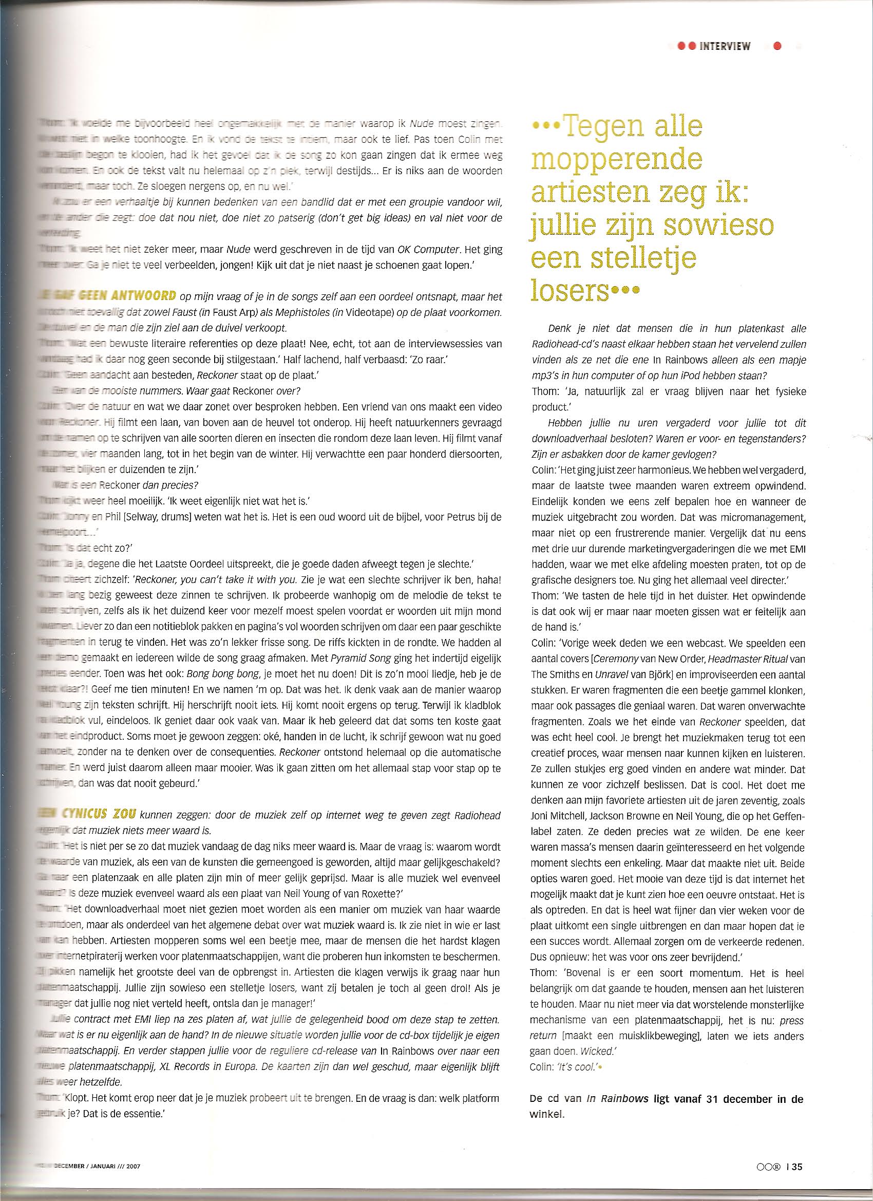 A brilliant manoeuvre according to some, a clever marketing trick to others. Or is the truth still a little bit different? In conversation with singer Thom Yorke and bass player Colin Greenwood about the strategy’s behind In Rainbows… but above all about the music itself.