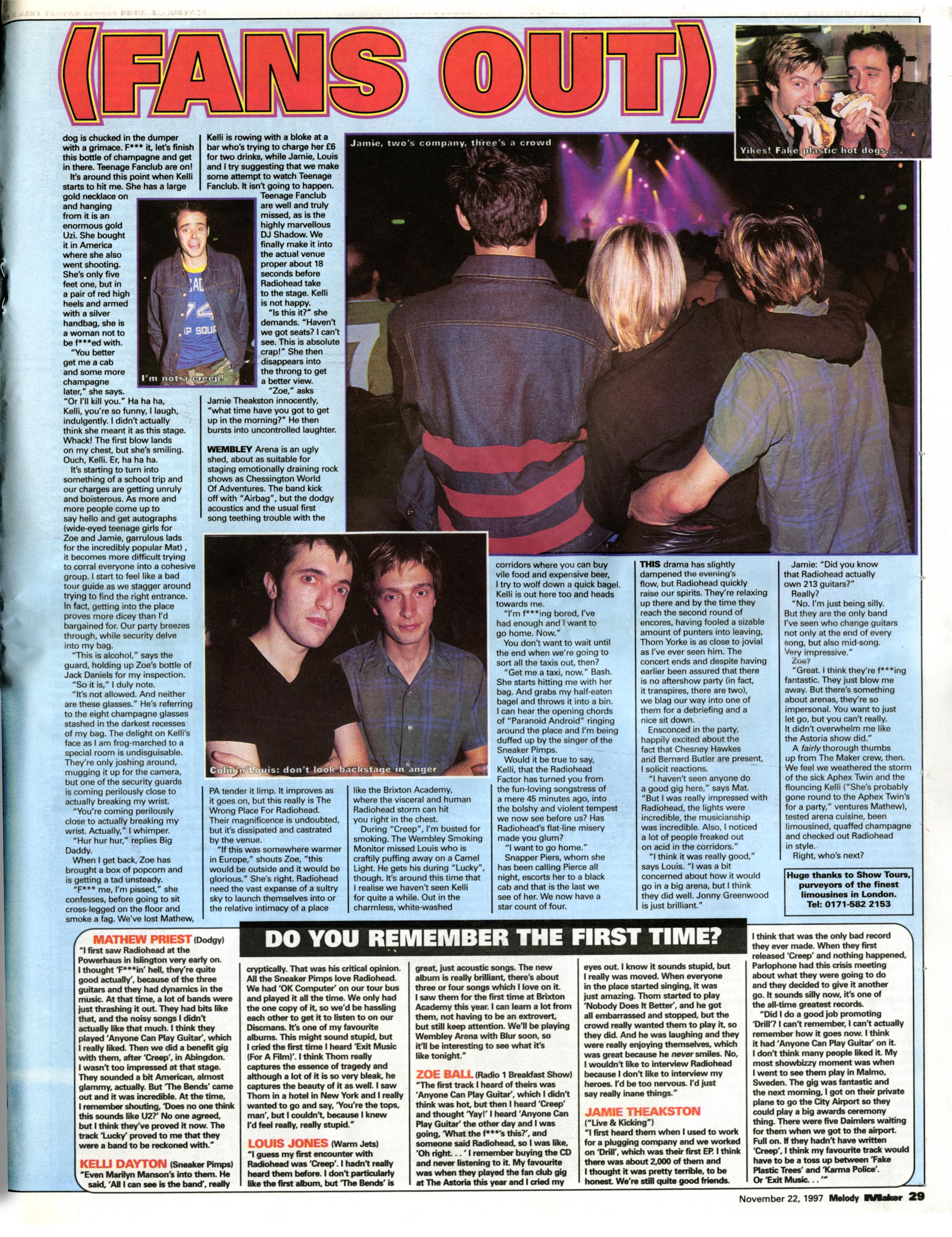“The first track I heard of theirs was ‘Anyone Can Play Guitar’, which I didn’t think was hot, but then I heard ‘Creep’ and thought ‘Yay!’ I heard ‘Anyone Can Play Guitar’ the other day and I was going, ‘What the f***’s this?’, and someone said Radiohead, so I was like, ‘oh right…’ I remember buying the CD and never listening to it. My favourite was when they played the fan club gig at The Astoria this year and I cried my eyes out. I know it sounds stupid, but I really was moved. When everyone in the place started singing, it was just amazing. Thom started to play ‘Nobody Does It Better’, and he got all embarrassed and stopped, but the crowd realty wanted them to play it, so they did. And he was laughing and they we’re really enjoying themselves. Which was great because he never smiles. No, I wouldn’t like to interview Radiohead because I don’t like to interview my heroes. I’d be too nervous. I’d just say realty inane things.”