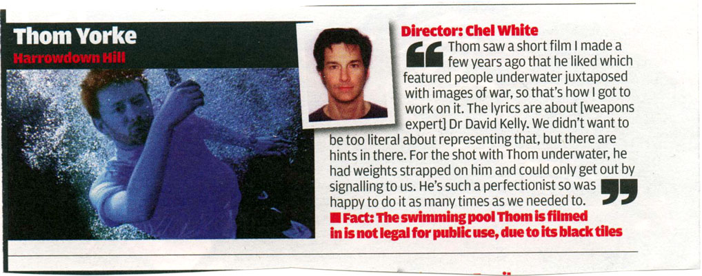 “Thom saw a short film I made a few years ago that he liked which featured people underwater juxtaposed with images of war, so that’s how I got to work on it. The lyrics are about [weapons expert] Dr David Kelly. We didn’t want to be too literal about representing that, but there are hints in there. For the shot with Thom underwater, he had weights strapped on him and could only get out by signalling to us. He’s such a perfectionist so was happy to do it as many times as we needed to.”