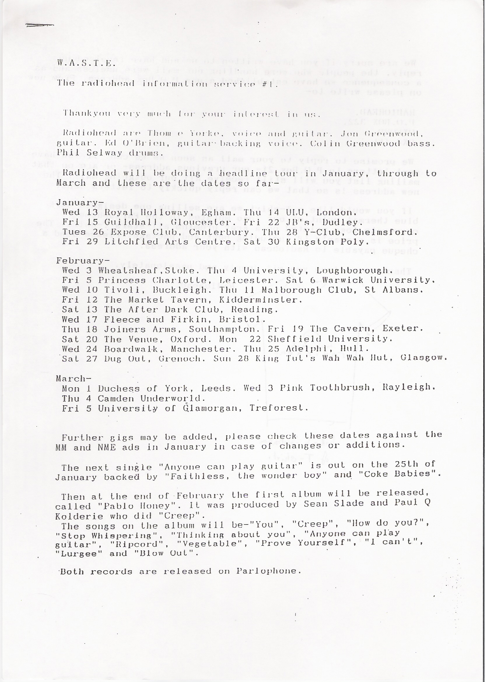 The songs on the album will be–“You”, “Creep”, “How do you?”, “Stop Whispering”, “Thinking about you”, “Anyone can play guitar”, “Ripcord”, “Vegetable”, “Prove Yourself”, “I can't”, “Lurgee” and “Blow Out”.