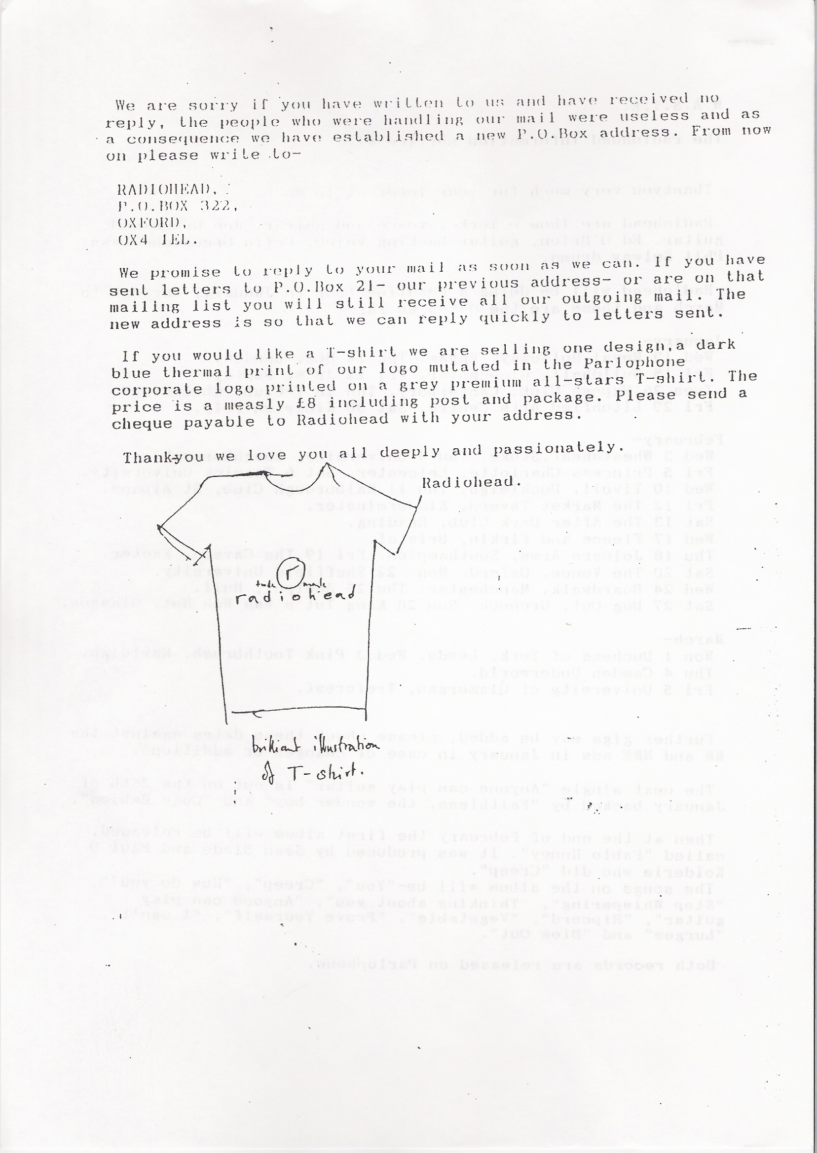If you would like a T-shirt we are selling one design,a dark blue thermal print of our logo mutated in the Parlophone corporate logo printed on a grey premium all-stars T-shirt. The price is a measly £8 including post and package. Please send a cheque payable to Radiohead with your address.