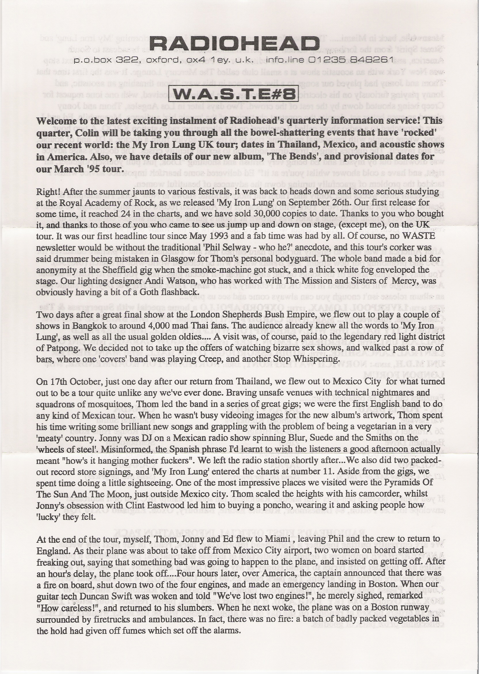Welcome to the latest exciting instalment of Radiohead’s quarterly information service! This quarter, Colin will be taking you through all the bowel-shattering events that have ‘rocked’ our recent world: the My Iron Lung UK tour, dates in Thailand, Mexico, and acoustic shows in America. Also, we have details of our new album, ‘The Bends’, and provisional dates for our March ‘95 tour.