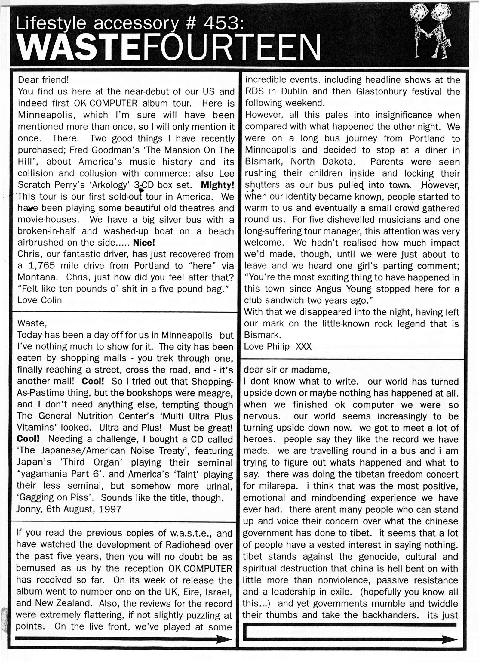 If you read the previous copies of w.a.s.t.e., and have watched the development of Radiohead over the past five years, then you will no doubt be as bemused as us by the reception OK COMPUTER has received so far. On its week of release the album went to number one on the UK, Eire, Israel, and New Zealand. Also, the reviews for the record were extremely flattering, if not slightly puzzling at points. On the live front, we’ve played at some incredible events, including headline shows at the RDS in Dublin and then Glastonbury festival the following weekend.