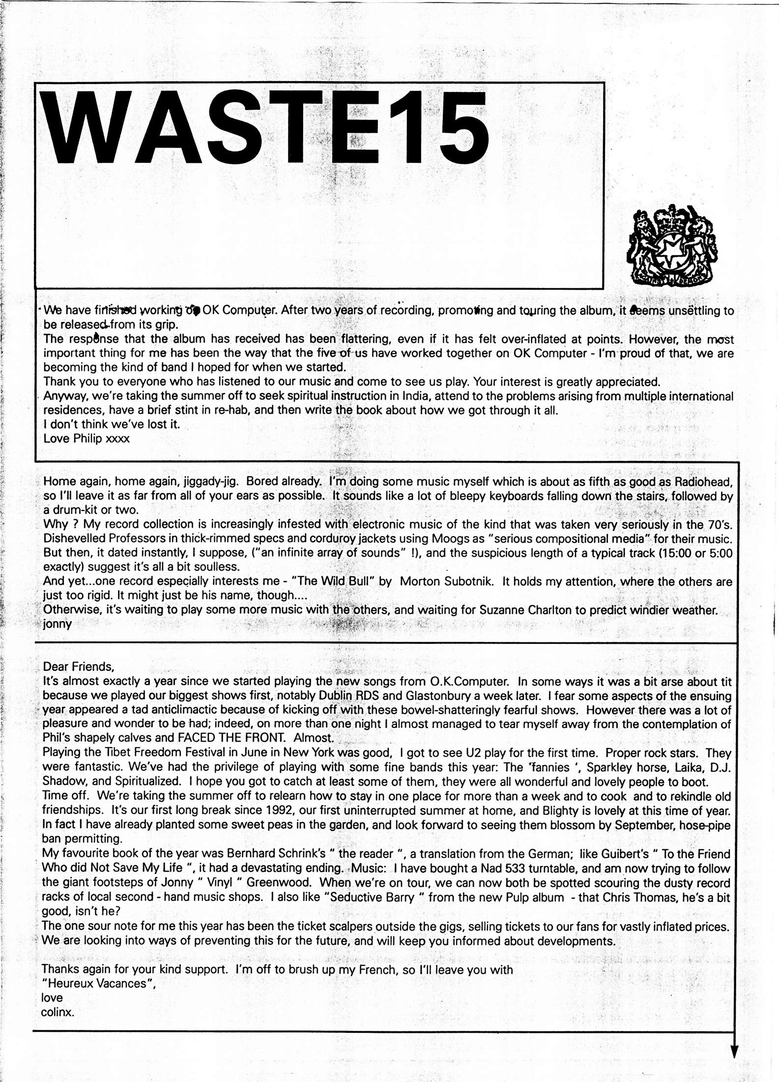 We have finished working on OK Computer. After two years of recording, promoting and touring the album, it seems unsettling to be released from its grip.