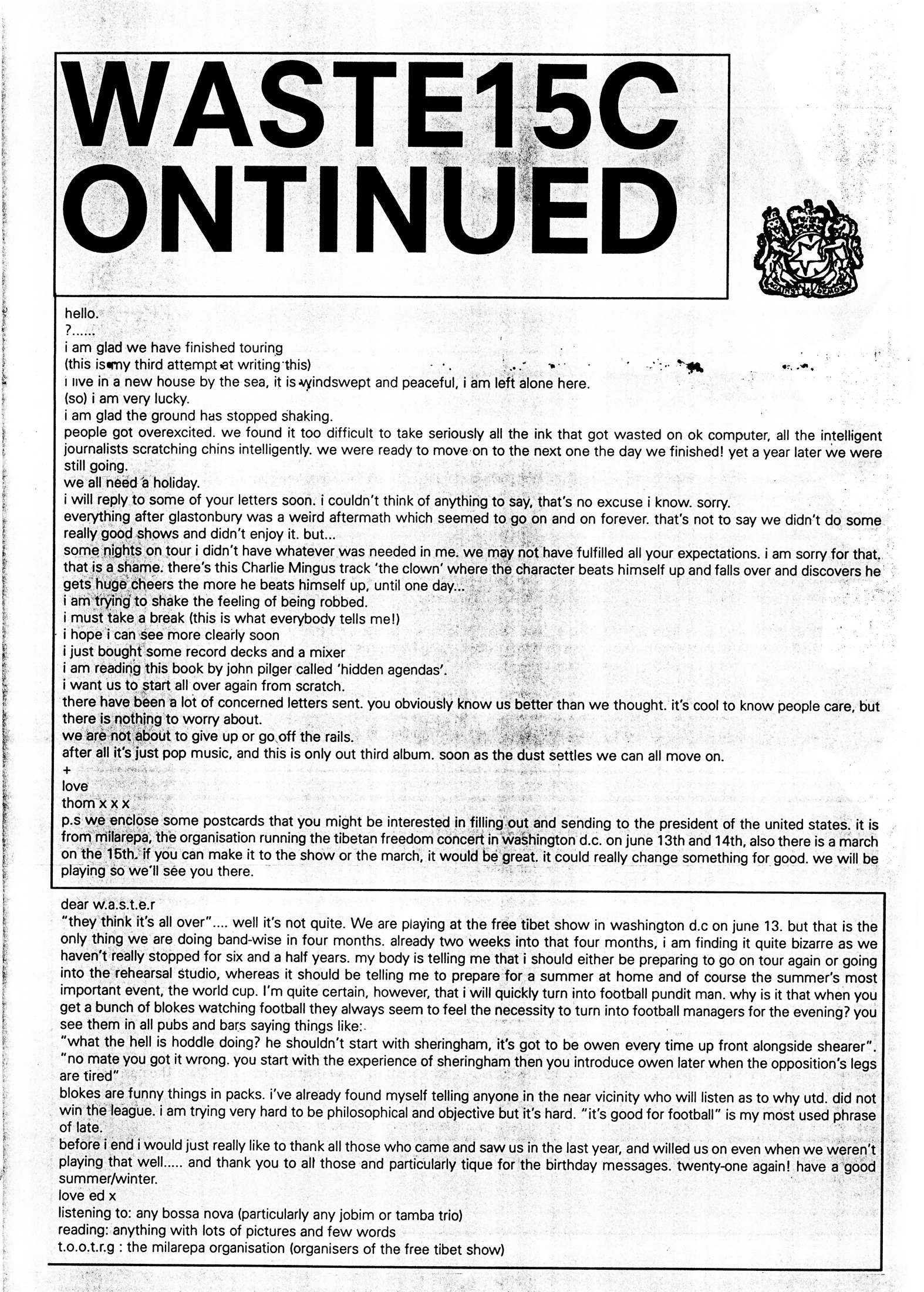 p.s. we enclose some postcards that you might be interested in filling out and sending to the president of the united states. it is from milarepa, the organisation running the tibetan freedom concert in washington d.c. on june 13th and 14th, also there is a march on the 15th. if you can make it to the show or the march, it would be great. it could really change something for good. we will be playing so we'll see you there.