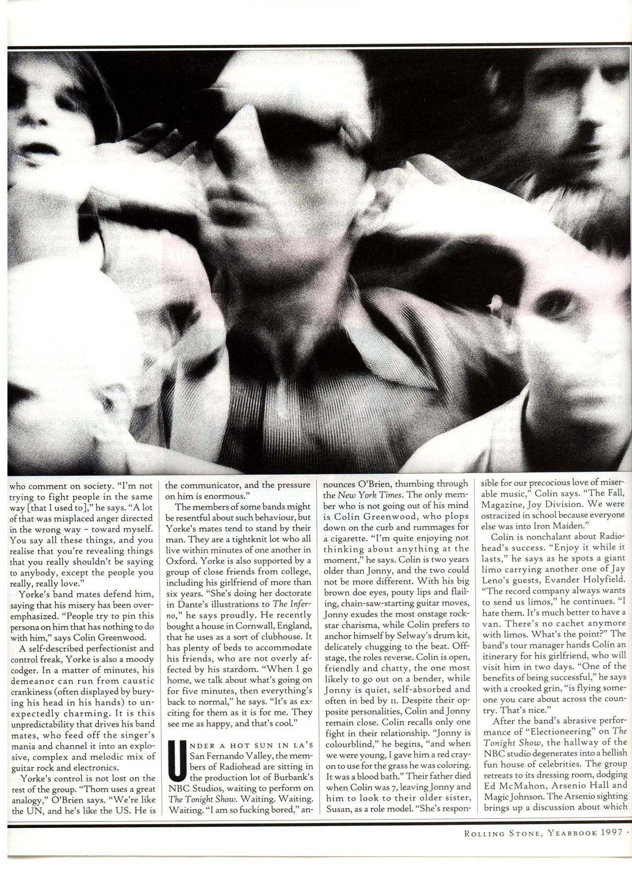 UNDER a hot sun in L.A.'s San Fernando Valley, the members of Radiohead are sitting in the production lot of Burbank's NBC Studios, waiting to perform on The Tonight Show. Waiting. Waiting. Waiting. "I am so fucking bored", announces O'Brien, thumbing through the New York Times. The only member who is not going out of his mind is Colin Greenwood, who plops down on the curb and rummages for a cigarette. "I'm quite enjoying not thinking about anything at the moment", he says. Colin is two years older than Jonny, and the two couldn't be more different. With his big brown eyes, pouty lips and flailing, chain-saw-starting guitar moves, Jonny exudes the most onstage rock-star charisma, while Colin prefers to anchor himself by Selway's drum kit, delicately chugging to the beat. Offstage, the roles reverse. Colin is open, friendly and chatty, the one most likely to go out on a bender, while Jonny is quiet, self-absorbed and often at bed by 11. Despite their opposite personalities, Colin and Jonny remain close. Colin recalls only one fight in their relationship. "Jonny is colorblind", he begins, "and when we were young, I gave him a red crayon to use for the grass he was drawing. It was a blood bath". Their father died when Colin was 7, leaving Jonny and him to look to their older sister, Susan, as a role model. "she's responsible for our precocious love of miserable music", Colin says. "The Fall, Magazine, Joy Division. We were ostracized at school because everyone else was into Iron Maiden".