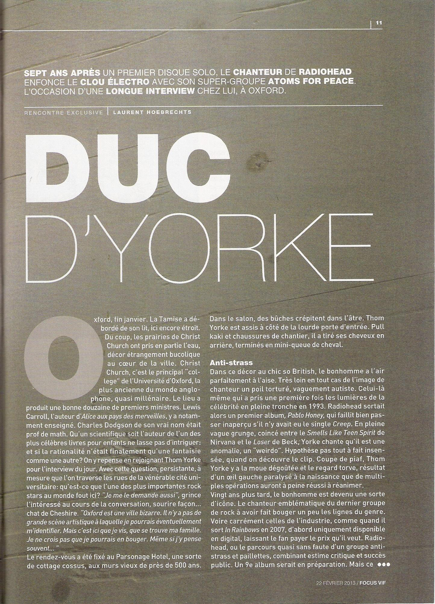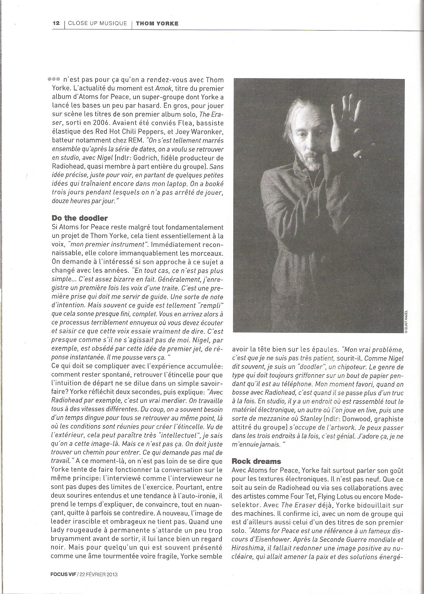Vingt ans plus tard, le bonhomme est devenu une sorte d’icône. Le chanteur emblématique du dernier groupe de rock à avoir fait bouger un peu les lignes du genre. Voire carrément celles de l’industrie, comme quand il sort In Rainbows en 2007, d’abord uniquement disponible en digital, laissant le fan payer le prix qu’il veut. Radiohead, ou le parcours quasi sans faute d’un groupe anti-strass et paillettes, combinant estime critique et succès public. Un 9e album serait en préparation. Mais ce n’est pas pour ça qu’on a rendez-vous avec Thom Yorke. L’actualité du moment est Amok, titre du premier album d’Atoms for Peace, un super-groupe dont Yorke a lancé les bases un peu par hasard. En gros, pour jouer sur scène les titres de son premier album solo, The Eraser, sorti en 2006. Avaient été conviés Flea, bassiste élastique des Red Hot Chili Peppers, et Joey Waronker, batteur notamment chez REM. “On s’est tellement marrés ensemble qu’après la série de dates, on a voulu se retrouver en studio, avec Nigel (ndlr: Godrich, fidèle producteur de Radiohead, quasi membre à part entière du groupe). Sans idée précise, juste pour voir, en partant de quelques petites idées qui traînaient encore dans mon laptop. On a booké trois jours pendant lesquels on n’a pas arrêté de jouer, douze heures par jour.”