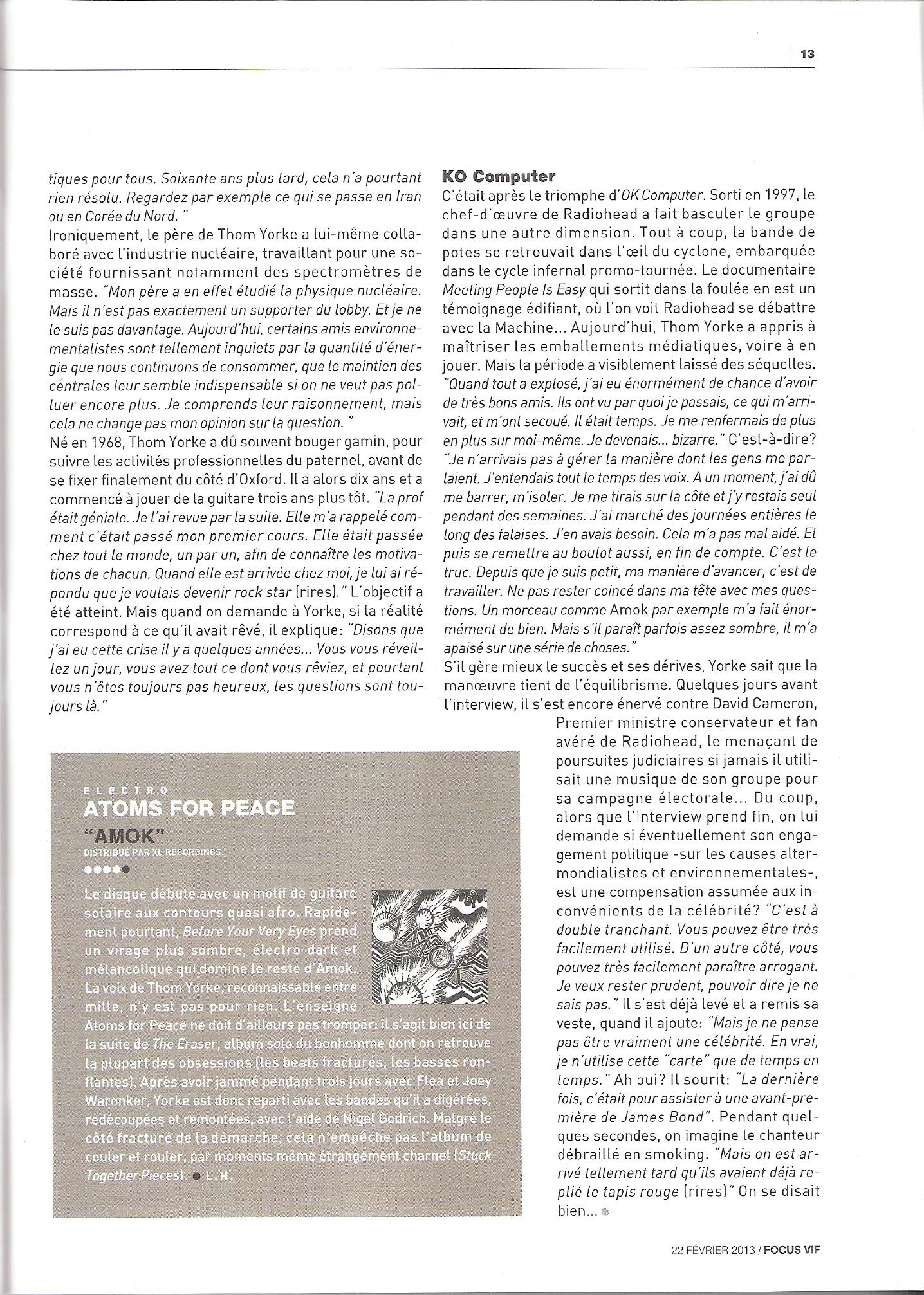 Ironiquement, le père de Thom Yorke a lui-même collaboré avec l’industrie nucléaire, travaillant pour une société fournissant notamment des spectromètres de masse. “Mon père a en effet étudié la physique nucléaire. Mais il n’est pas exactement un supporter du lobby. Et je ne le suis pas davantage. Aujourd’hui, certains amis environnementalistes sont tellement inquiets par la quantité d’énergie que nous continuons de consommer, que le maintien des centrales leur semble indispensable si on ne veut pas polluer encore plus. Je comprends leur raisonnement, mais cela ne change pas mon opinion sur la question.”