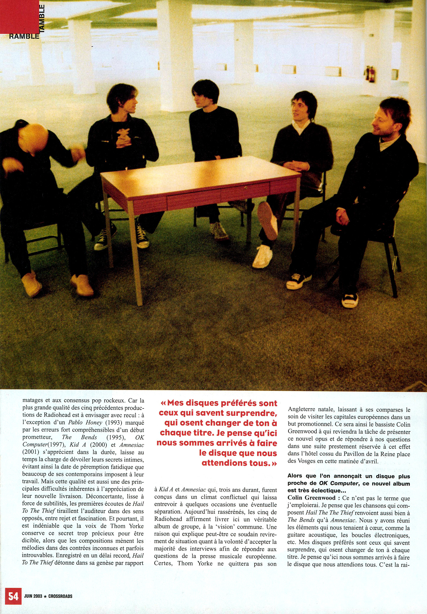 PEU DE GROUPES AURONT CONNU AUTANT DE SUCCÈS. TOUT LE MONDE S'ACCORDE À LE DIRE, MÉDIAS, MUSICIENS ET CRITIQUES, RADIOHEAD EST AUJOURD'HUI INCONTOURNABLE. AVEC HAIL TO THE THIEF, LEUR SIXIÈME OPUS, THOM YORKE ET SA BANDE S'IMPOSENT DÉSORMAIS COMME LES HÉROS D'UN DE NOS NOUVEAUX MYTHES MODERNES.