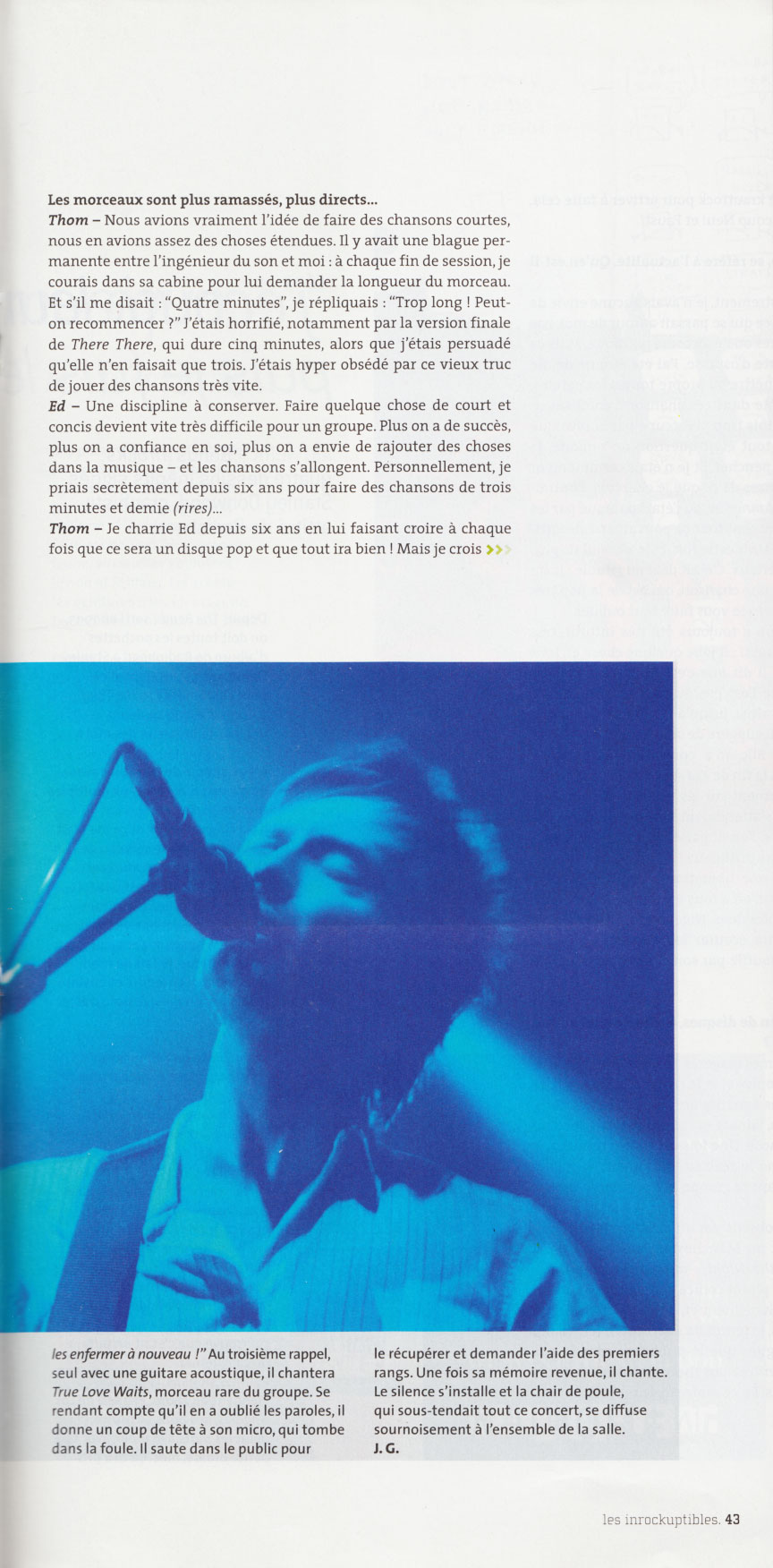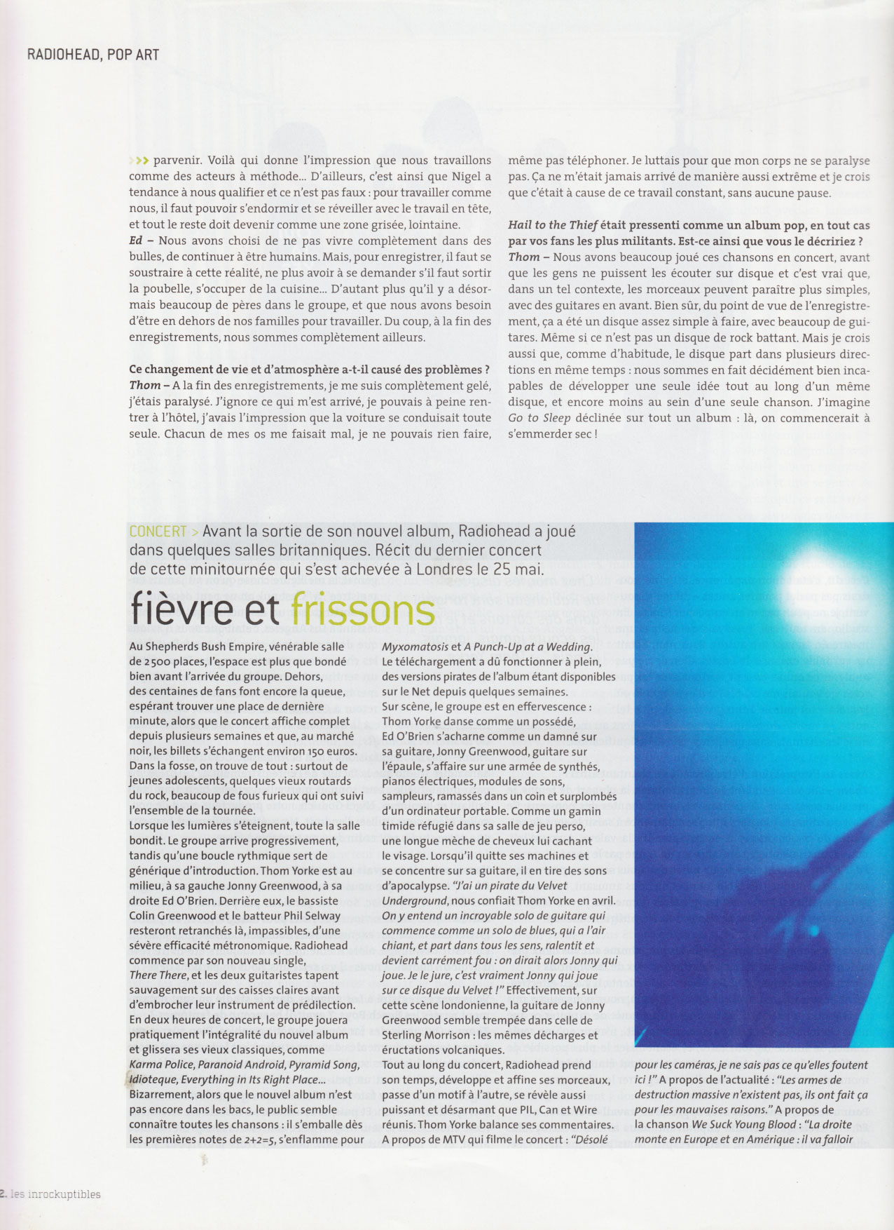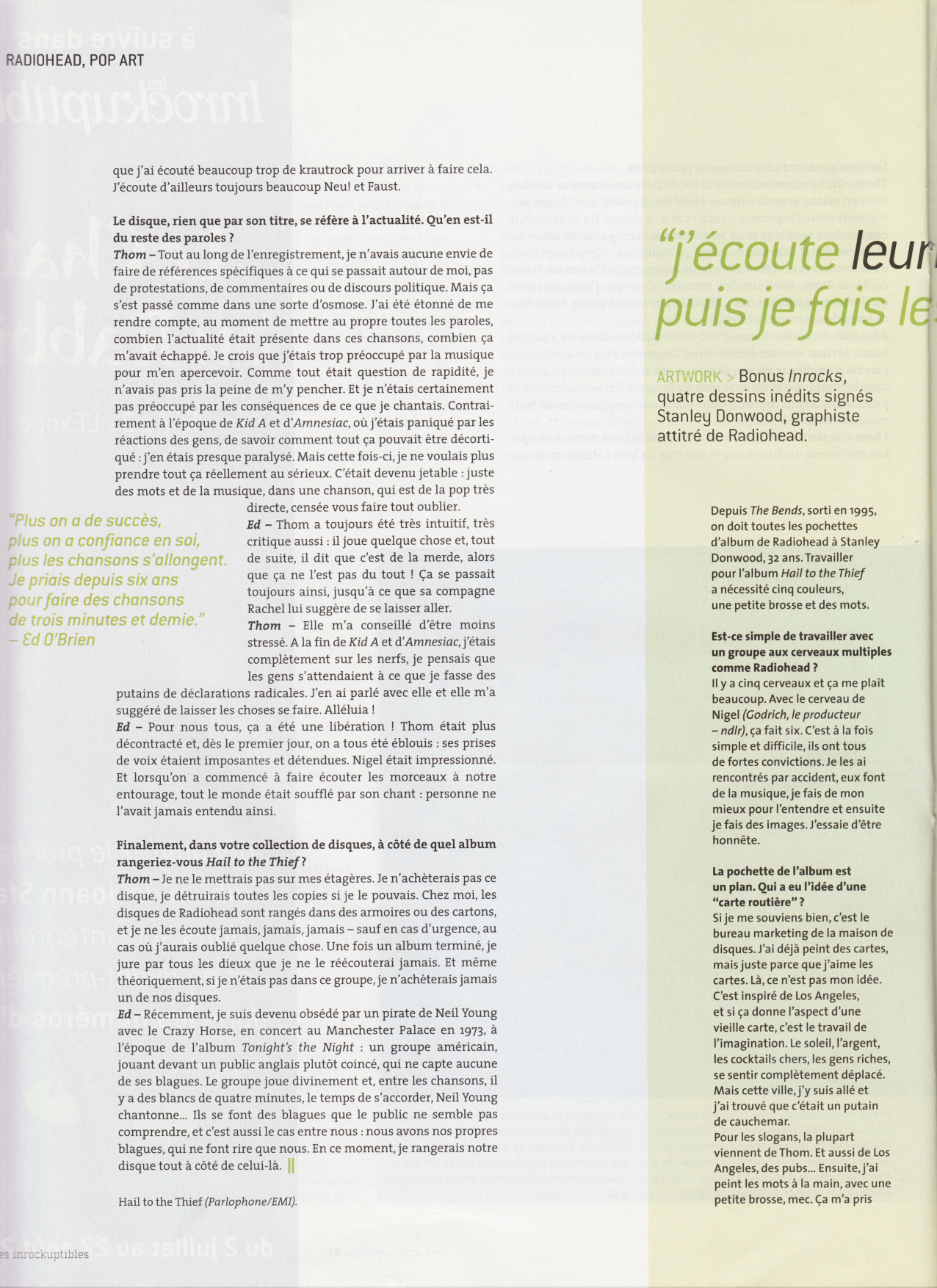 Ceci dit, c'était mon expérience, et je ne voudrais pas parler pour les autres - même si, souvent, je ne peux pas m'en empêcher (rires)... En studio, en tout cas, j'essayais de ne pas me mettre en travers des autres. Pour moi, c'était un véritable exercice de laisser aller, de ne pas analyser ce qui se passait, surtout avec les paroles : je voulais me contenter d’exprimer là où ; en étais tel jour de l'enregistrement, puis tel autre. La moitié du temps, les paroles sortaient au moment même où je les chantais, sans que j'en perçoive la signification. Avais-tu l’impression d’être possédé en chantant ainsi ? Thom - Oh oui... Pendant l'enregistrement, la plupart de temps, je me suis senti ainsi. Je pensais vraiment chanter des non-sens. Ce r est qu'un mois plus tard que j’ai commencé à saisir le sens de certaines de ces chansons, à en comprendre la valeur. Aujourd'hui, r.ous avons davantage confiance en nous que par le passé. Ed O’Brien - Et cela sans doute parce que nous sommes parvenus à i ortir de ce disque très facilement et en nous amusant. La musique qui en a jailli est tout aussi bonne, alors même que j'avais toujours :ru que faire un bon disque nécessitait de souffrir beaucoup. Avez-vous beaucoup remodelé le disque, comme sur vos deux précédents albums, qui étaient de vrais travaux de laborantins ? Thom - Pas tellement. Sur les disques précédents, il y a eu effective-ment beaucoup de travail d'édition. Mais là, nous nous étions mis r: tête que nous n’aurions qu'une seule chance de capturer ce que r. rus cherchions. C’est ce qui nous manquait : n'avoir qu'une seule chance, se foutre de tout rater, et économiser le plus possible de 5 : -ffrance de studio. Après avoir répété, tout était dirigé vers ces - : ments particuliers, où l'on allait enregistrer les chansons. Pour une fois, donc, vous avez apprécié ce travail de studio... Ed - Je crois qu'en studio auparavant, nous avions d'incroyables chargements d’humeur, d'état d'esprit. Nous passions de : "C'est génial, la meilleure chose qu’on ait jamais enregistrée”, à "C’est nul, on ne peut décemment pas sortir ça sur un disque.” Ce qui était intéressant à Los Angeles, c'était que nous n'avions que deux semaines et qu’il nous fallait faire les choses sans pouvoir y penser. Et ça, c'était un sentiment incroyable. Fini les autocompliments genre : "C'est génial, incroyable.” Puis, de retour à Oxford, nous avons aussi eu des moments étonnants : c’est là que nous avons enregistré les morceaux Go to SIeep et Backdrifts. Thom - Quand nous faisions Kid A et Amnesiac, c'était un tel labeur dans notre studio que la facilité de l’enregistrement de Go to Sleep a paru inhabituelle : tout sonnait merveilleusement bien, tout était brillant et lumineux. Nigel Godrich, notre producteur, avait de nouvelles idées pour utiliser l'endroit. Nous étions tellement heureux que notre studio soit enfin devenu agréable à vivre. Vous y aviez de mauvais souvenirs ? Ed - Cet endroit, que nous avions acheté et converti pour enregistrer Kid A et Amnesiac, nous ne pensions pas pouvoir y refaire un autre disque... Nous savions que nous pouvions y répéter, ou y enregistrer une basse par exemple, mais nous pensions ne plus pouvoir l'investir davantage, alors même que ça a toujours été notre rêve d'avoir un endroit à nous : il y a seize ans, nous en parlions déjà. Vous avez enregistré à Los Angeles, dans le studio où sont notamment passés les Beach Boys. Y avait-il beaucoup de fantômes ? Thom - Oui, mais des fantômes plutôt agréables. Bien sùr, ce qui nous a toujours emmerdés dans un studio, c’est le temps qui passe et toutes les histoires sur les groupes qui nous y ont précédés, etc. Aller en studio, c'est un peu comme aller chez le médecin. Mais Nigel voulait nous y faire travailler : il est vrai que l'endroit sonne incroyablement bien. Et puis, se soustraire au monde est une excellente chose. C'est le seul moyen de se concentrer lorsqu'on travaille ainsi, et il nous faut toujours deux ou trois jours pour y parvenir. Voilà qui donne l'impression que nous travaillons comme des acteurs à méthode... D'ailleurs, c'est ainsi que Nigel a tendance à nous qualifier et ce n'est pas faux : pour travailler comme nous, il faut pouvoir s'endormir et se réveiller avec le travail en tête, et tout le reste doit devenir comme une zone grisée, lointaine. Ed - Nous avons choisi de ne pas vivre complètement dans des bulles, de continuer à être humains. Mais, pour enregistrer, il faut se soustraire à cette réalité, ne plus avoir à se demander s’il faut sortir la poubelle, s'occuper de la cuisine... D'autant plus qu'il y a désormais beaucoup de pères dans le groupe, et que nous avons besoin d'être en dehors de nos familles pour travailler. Du coup, à la fin des enregistrements, nous sommes complètement ailleurs. Ce changement de vie et d'atmosphère a-t-il causé des problèmes ? Thom - A la fin des enregistrements, je me suis complètement gelé, j’étais paralysé. J'ignore ce qui m'est arrivé, je pouvais à peine rentrer à l’hôtel, j'avais l'impression que la voiture se conduisait toute seule. Chacun de mes os me faisait mal, je ne pouvais rien faire, même pas téléphoner. Je luttais pour que mon corps ne se paralyse pas. Ça ne m'était jamais arrivé de manière aussi extrême et je crois que c’était à cause de ce travail constant, sans aucune pause. Hail to the Thief était pressenti comme un album pop, en tout cas par vos fans les plus militants. Est-ce ainsi que vous le décririez ? Thom - Nous avons beaucoup joué ces chansons en concert, avant que les gens ne puissent les écouter sur disque et c’est vrai que. dans un tel contexte, les morceaux peuvent paraître plus simples, avec des guitares en avant. Bien sûr, du point de vue de l'enregistrement, ça a été un disque assez simple à faire, avec beaucoup de guitares. Même