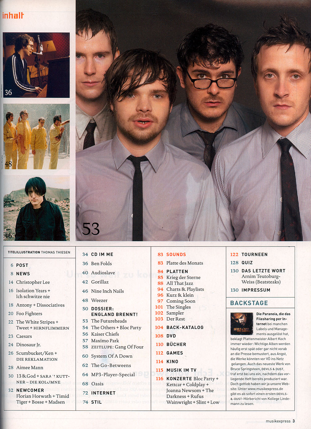 „Um Tony Blair und Gordon Brown an ihre Versprechungen zu erinnern”, nahm Thom Yorke am 15. April an einer von „War On Want” organisierten Demonstration für gerechten Handel mit armen Ländern teil. Der künstlerische Beitrag des Radiohead-Sängers zu der Kampagne, zu der sich 25.000 Menschen in London versammelten, bestand in einer fünfstündigen Malperformance (mit Unterstützung seines Freundes Stanley Donwood) und einem Akustikauftritt in der Methodist Central Hall. Dort gab Yorke „No Surprises”, „Glass Flowers”, „Nude”, „Reckoner” sowie den nagelneuen Song „House Of Cards” zum besten.