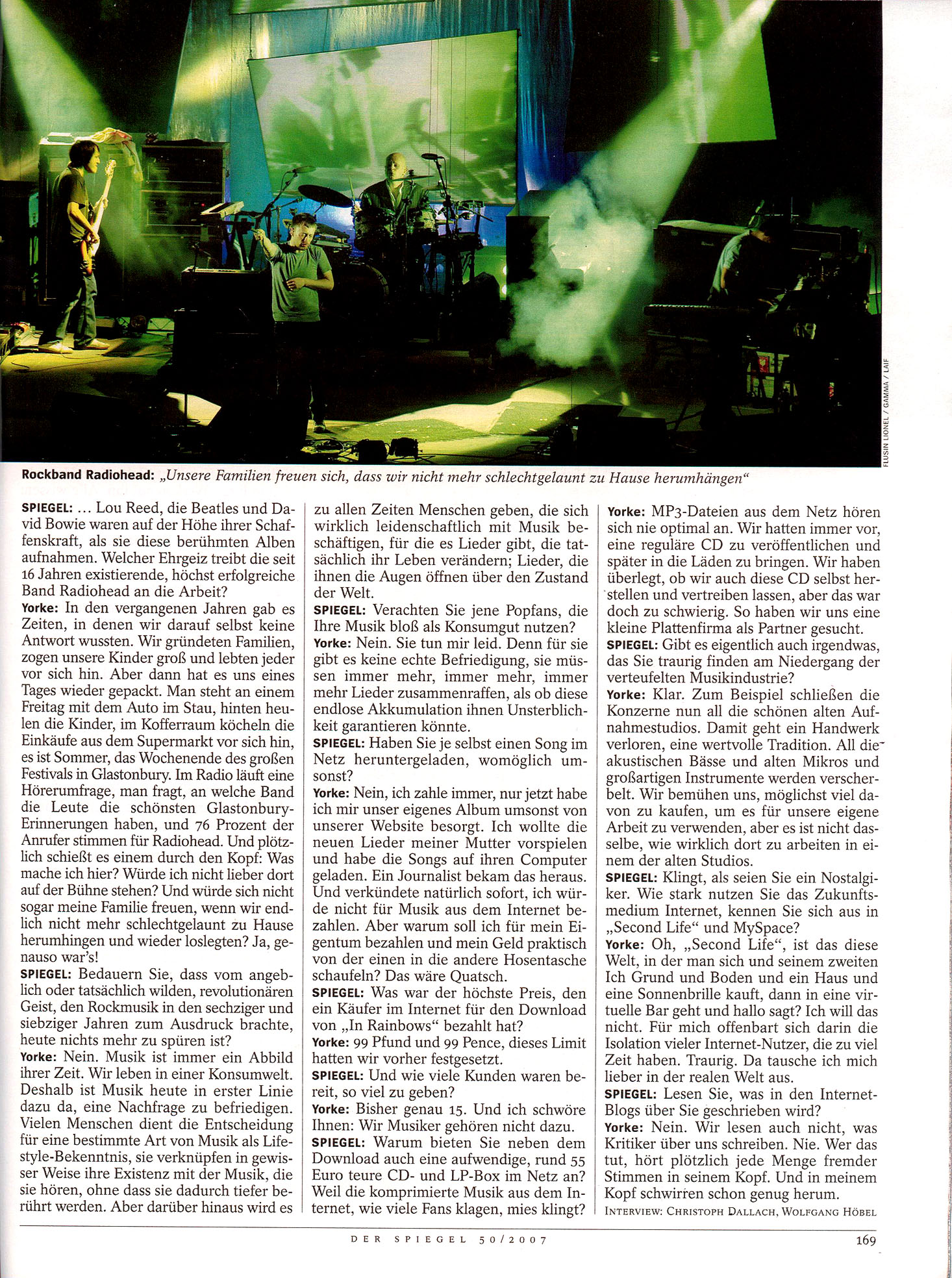 Yorke: Oh, "Second Life", ist das diese Welt, in der man sich und seinem zweiten Ich Grund und Boden und ein Haus und eine Sonnenbrille kauft, dann in eine virtuelle Bar geht und hallo sagt? Ich will das nicht. Für mich offenbart sich darin die Isolation vieler Internet-Nutzer, die zu viel Zeit haben. Traurig. Da tausche ich mich lieber in der realen Welt aus.