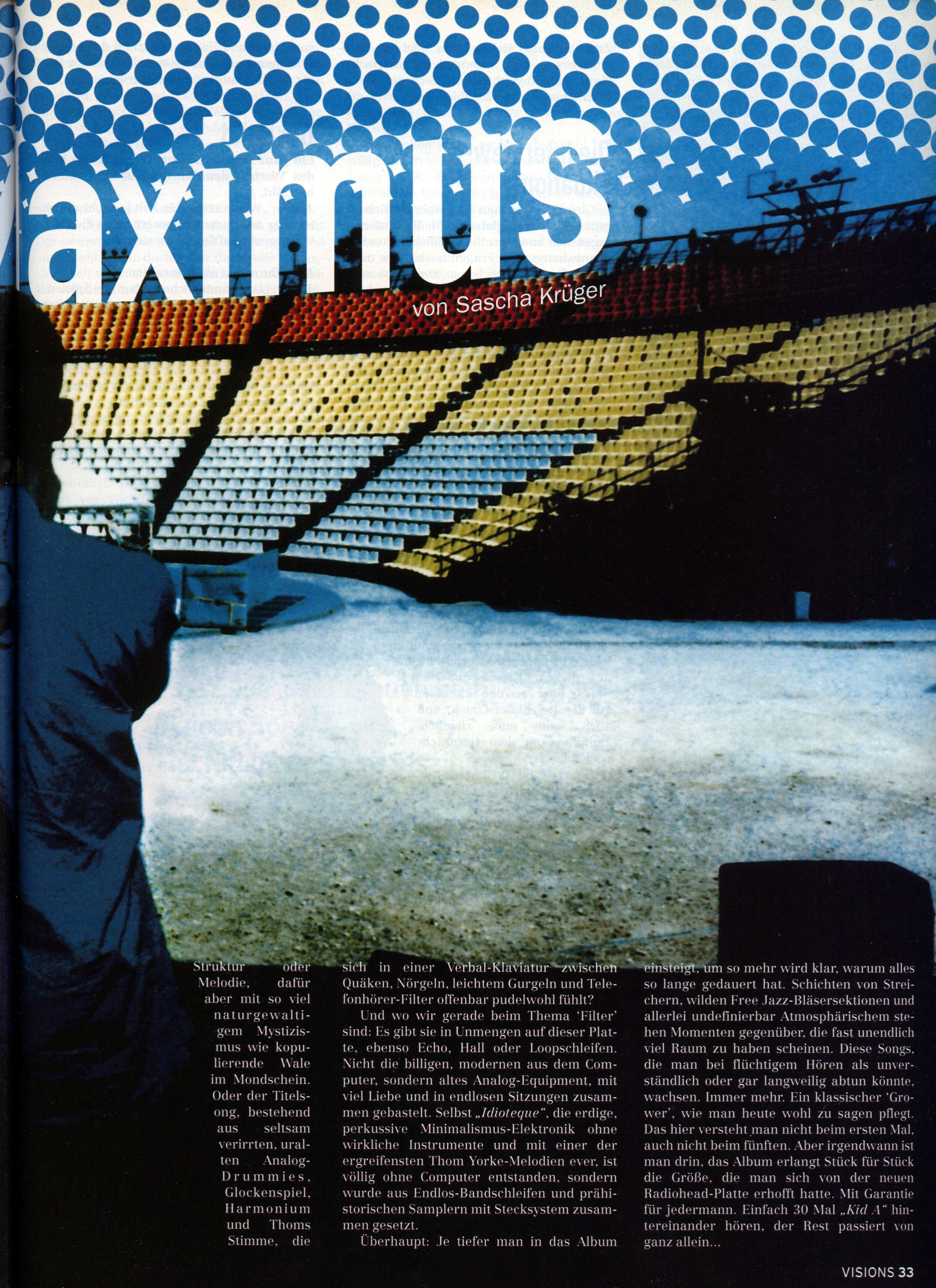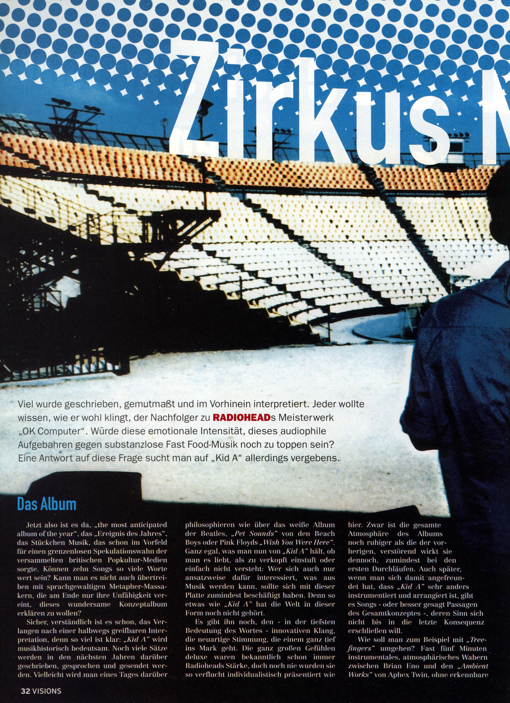 Thom: „Als wir so weit waren, ‘Kid A’ zusammenzustellen, haben wir versucht, das Album wie einen Song zu schreiben. Wir versuchten, es sich von selbst entwickeln zu lassen, und irgendwie hat es auch funktioniert. Im Moment stecken wir in dem Prozess, die Reste aufzusammeln und zu schauen, ob sie sich noch zu einem weiteren Song zusammenschreiben lassen.“