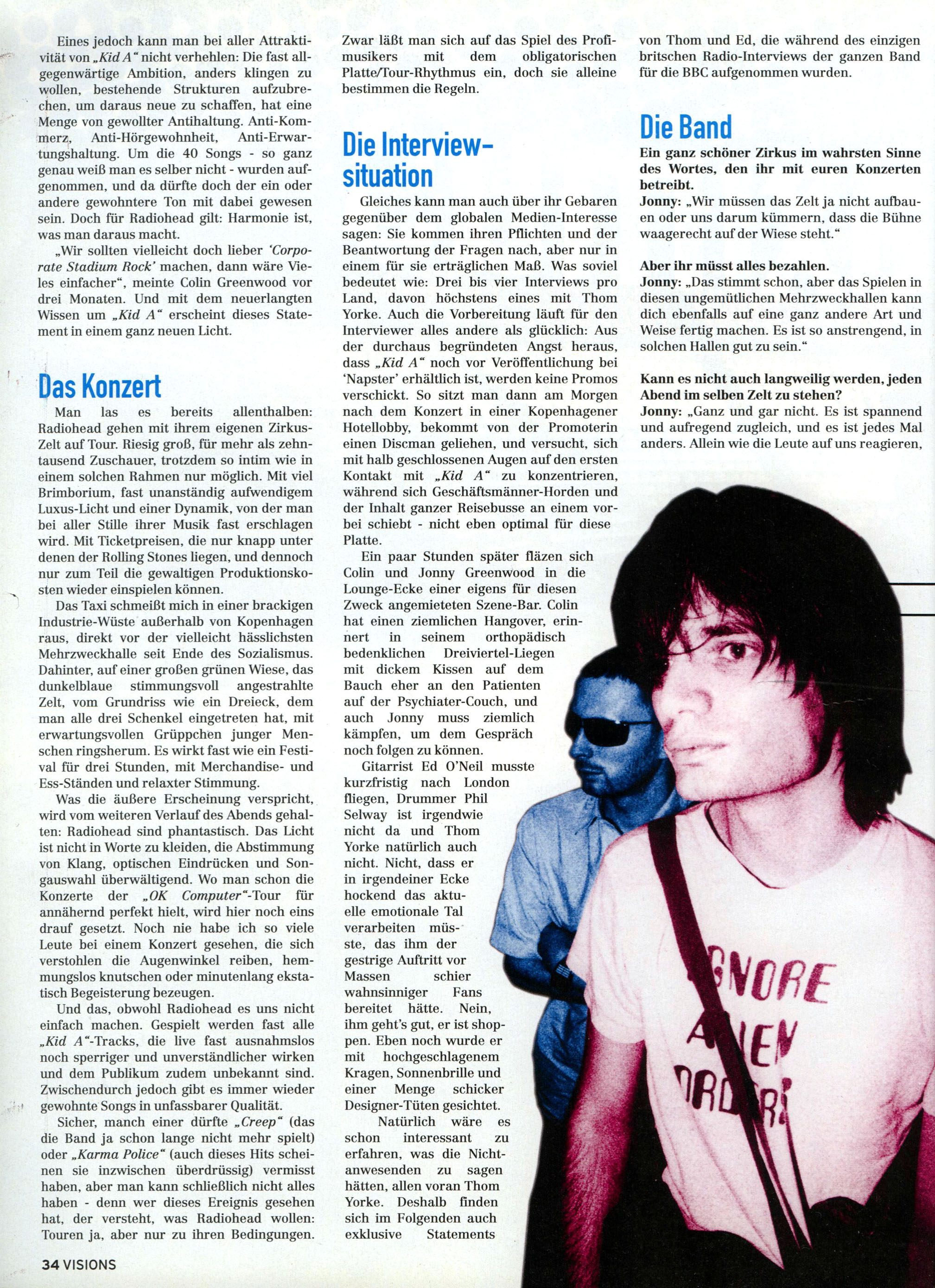 Gleiches kann man auch über ihr Gebaren gegenüber dem globalen Medien-Interesse sagen: Sie kommen ihren Pflichten und der Beantwortung der Fragen nach, aber nur in einem für sie erträglichen Maß. Was soviel bedeutet wie: Drei bis vier Interviews pro Land, davon höchstens eines mit Thom Yorke. Auch die Vorbereitung läuft für den Interviewer alles andere als glücklich: Aus der durchaus begründeten Angst heraus, dass „Kid A“ noch vor Veröffentlichung bei ‘Napster’ erhältlich ist, werden keine Promos verschickt. So sitzt man dann am Morgen nach dem Konzert in einer Kopenhagener Hotellobby, bekommt von der Promoterin einen Discman geliehen, und versucht, sich mit halb geschlossenen Augen auf den ersten Kontakt mit „Kid A“ zu konzentrieren, während sich Geschäftsmänner-Horden und der Inhalt ganzer Reisebusse an einem vorbei schiebt - nicht eben optimal für diese Platte.