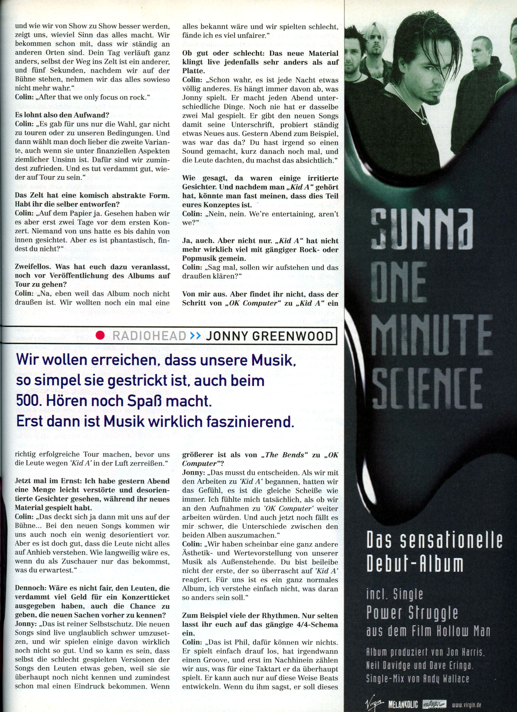 Colin: „Na, eben weil das Album noch nicht draußen ist. Wir wollten noch ein mal eine richtig erfolgreiche Tour machen, bevor uns die Leute wegen ‘Kid A’ in der Luft zerreißen.“