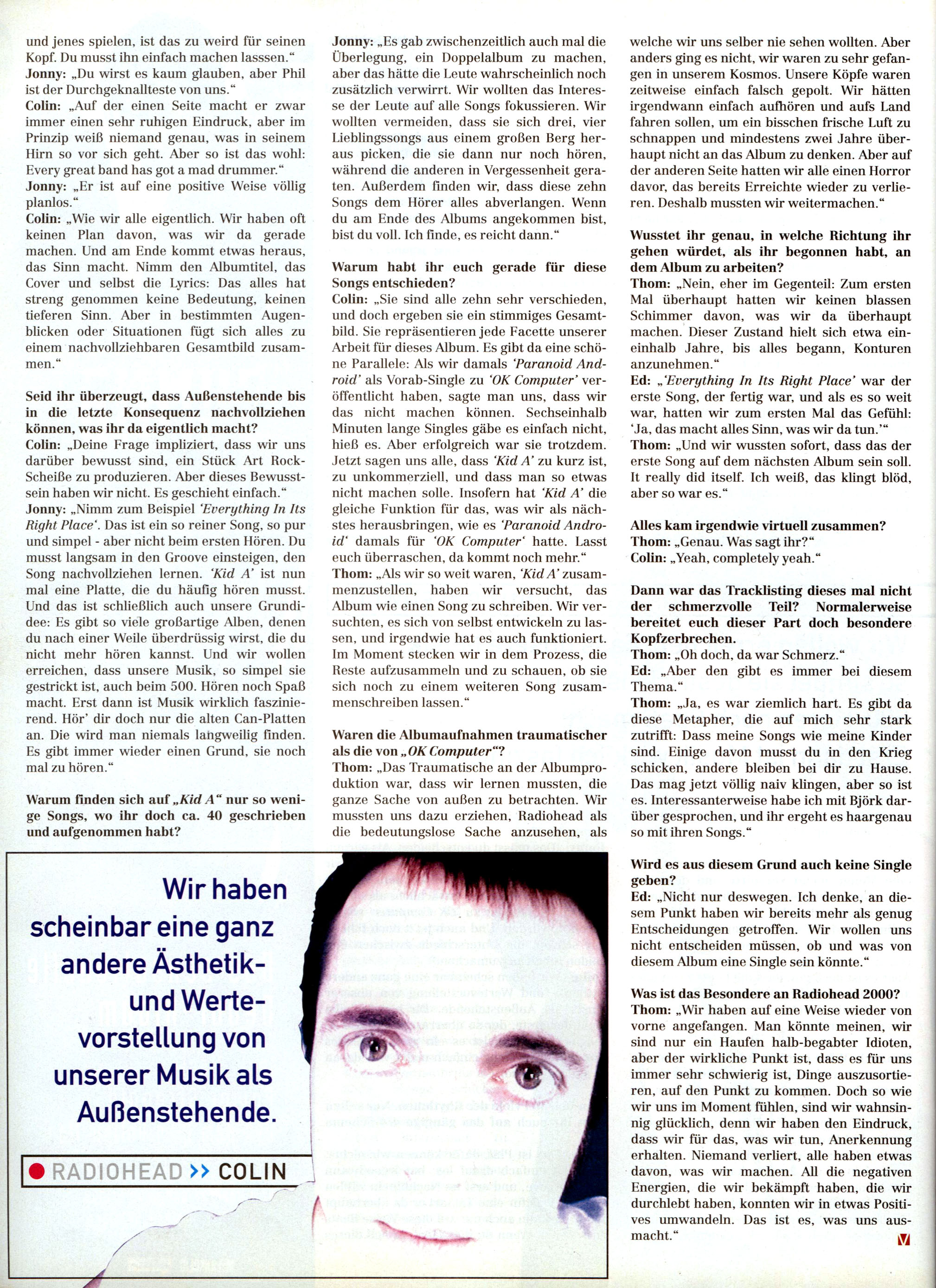 Colin: „Sie sind alle zehn sehr verschieden, und doch ergeben sie ein stimmiges Gesamtbild. Sie repräsentieren jede Facette unserer Arbeit für dieses Album. Es gibt da eine schöne Parallele: Als wir damals ‘Paranoid Android’ als Vorab-Single zu ‘OK Computer’ veröffentlicht haben, sagte man uns, dass wir das nicht machen können. Sechseinhalb Minuten lange Singles gäbe es einfach nicht, hieß es. Aber erfolgreich war sie trotzdem. Jetzt sagen uns alle, dass ‘Kid A’ zu kurz ist, zu unkommerziell, und dass man so etwas nicht machen solle. Insofern hat ‘Kid A’ die gleiche Funktion für das, was wir als nächstes herausbringen, wie es ‘Paranoid Android‘ damals für ‘OK Computer‘ hatte. Lasst euch überraschen, da kommt noch mehr.“