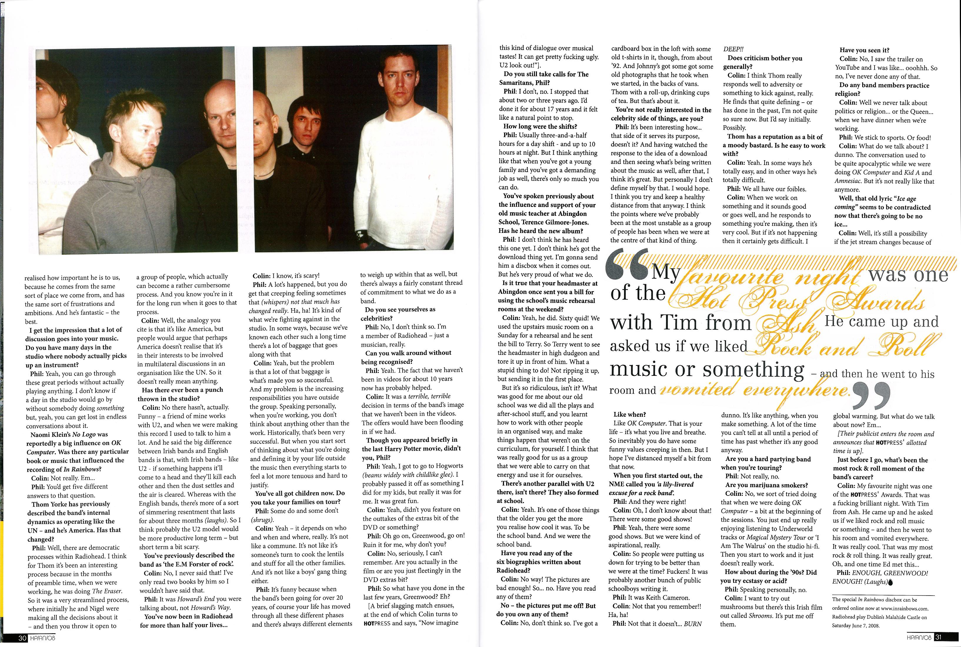 Roughly seven weeks after the historic ‘download only’ release of the band’s seventh studio album, In Rainbows, HotPress has been granted an audience with the Oxford alt-rockers’ rhythm and bass section. Guitarist Ed O’Brien is ensconced elsewhere in the hotel doing interviews, while Thom Yorke and Coz’s younger brother Jonny are apparently off doing TV stuff somewhere.