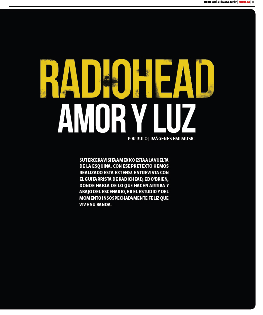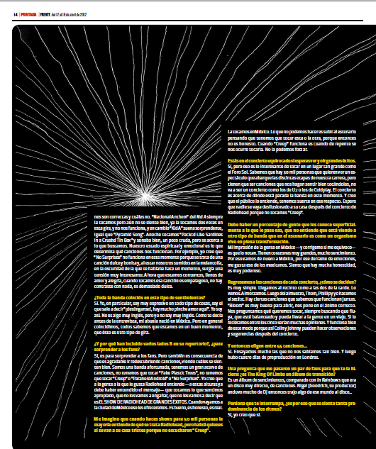 Ed: Sí, es para sorprender a los fans. Pero también es consecuencia de que es agradable ir redescubriendo canciones, viendo cuáles se sienten bien. Somos una banda afortunada, tenemos un gran acervo de canciones, no tenemos que tocar “Fake Plastic Trees”, no tenemos que tocar “Creep” o “Paranoid Android” o “No Surprises”. Yo creo que a la gente a la que le gusta Radiohead entiende —a estas alturas ya debe haber entendido el mensaje— que tocamos lo que sentimos apropiado, que no los vamos a engañar, que no les vamos a decir que es EL SHOW DE RADIO HEAD DE GR ANDES ÉXITOS . Cuando vayamos a la ciudad de México eso les ofreceremos. Es bueno, es honesto, es real.