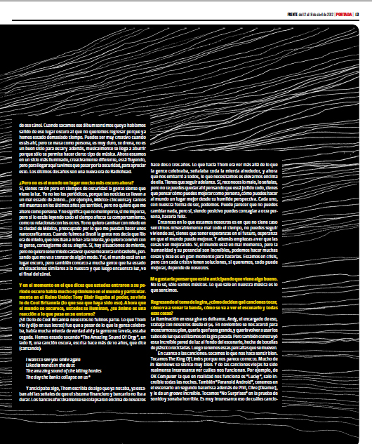 Ed: Es un álbum de sentimientos, comparado con In Rainbows que era un disco muy directo, de canciones. Nigel [Goodrich, su productor] anduvo mucho de DJ entonces trajo algo de ese mundo al disco…