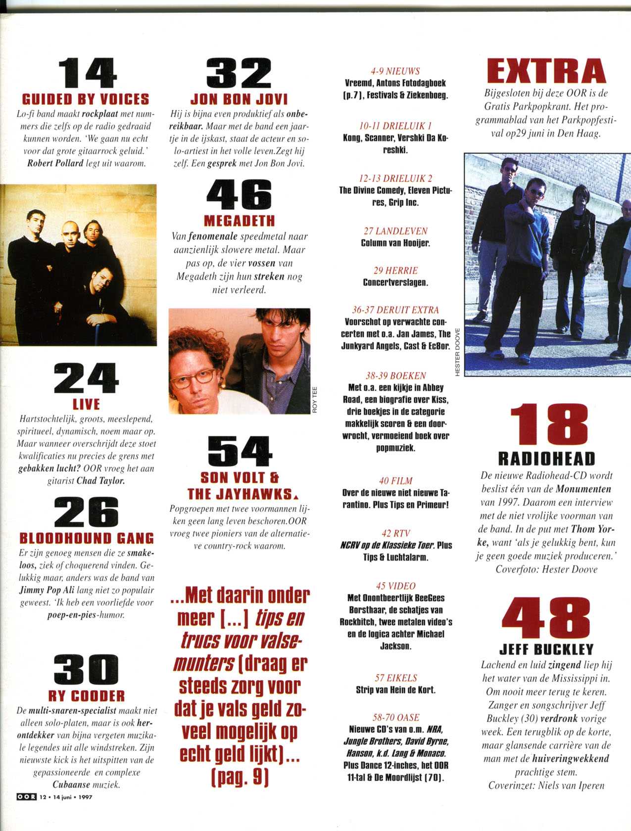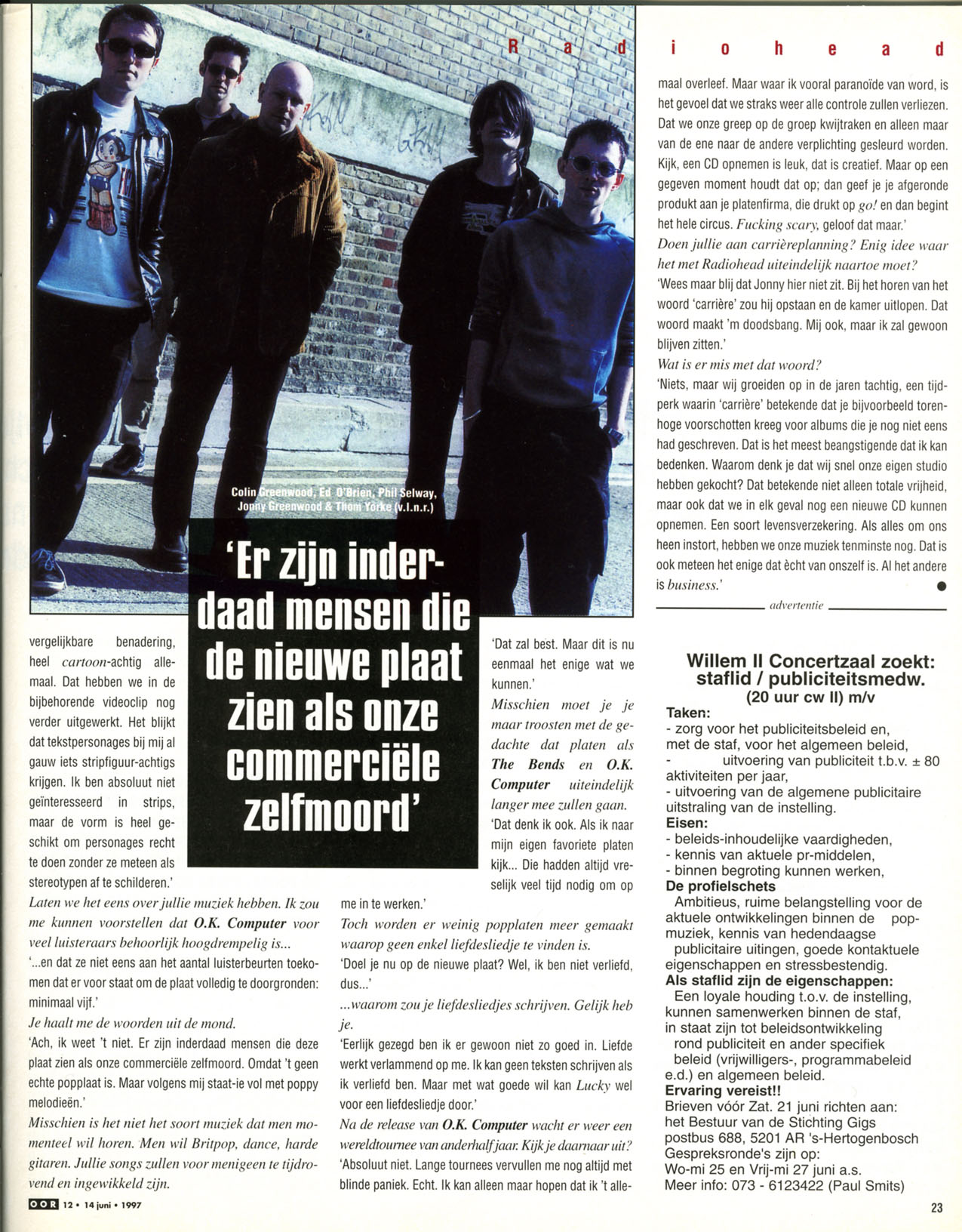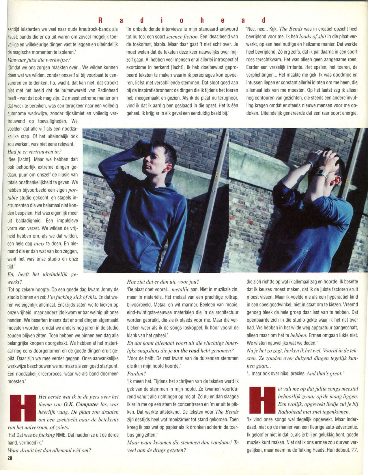 'Nee, nee... Kijk, The Bends was in creatief opzicht heel bevrijdend voor me. Ik heb loads of shit in die plaat ver-werkt, op een heel nuttige en heilzame manier. Dat werkte heel bevrijdend. Z6 erg zelfs, dat ik pal daarna in een soort roes terechtkwam. Het was alleen geen aangename roes. Eerder een vreselijk irritante. Het spelen, het toeren, de verplichtingen... Het maakte me gek. Ik was doodmoe en intussen liepen er constant allerlei idioten om me heen, die allemaal iets van me moesten. Op het laatst zag ik alleen nog contouren van gezichten, die steeds een andere invul-ling kregen omdat er steeds nieuwe mensen voor me op-doken. Uiteindelijk genereerde dat een raar soort energie, die zich richtte op wat ik allemaal zag en hoorde. Ik besefte dat ik keuzes moest maken, dat ik de juiste factoren emit moest vissen. Maar ik voelde me als een hyperactief kind in een speelgoedwinkel, niet in staat om te kiezen. Vreemd genoeg bleek de hele groep daar last van te hebben. Dat openbaarde zich in die studio-gekte waar ik het net over had. We hebben in het wilde weg apparatuur aangeschaft, alleen maar om het te hebben. Ermee omgaan lukte niet. We wisten nauwelijks wat we deden.' Nuje het zo zegt, herken ik het wel. Vooral in de teksten. Ze zouden over duizend dingen tegelijk kunnen gaan... '...maar ook over niks, precies. And that's great.'