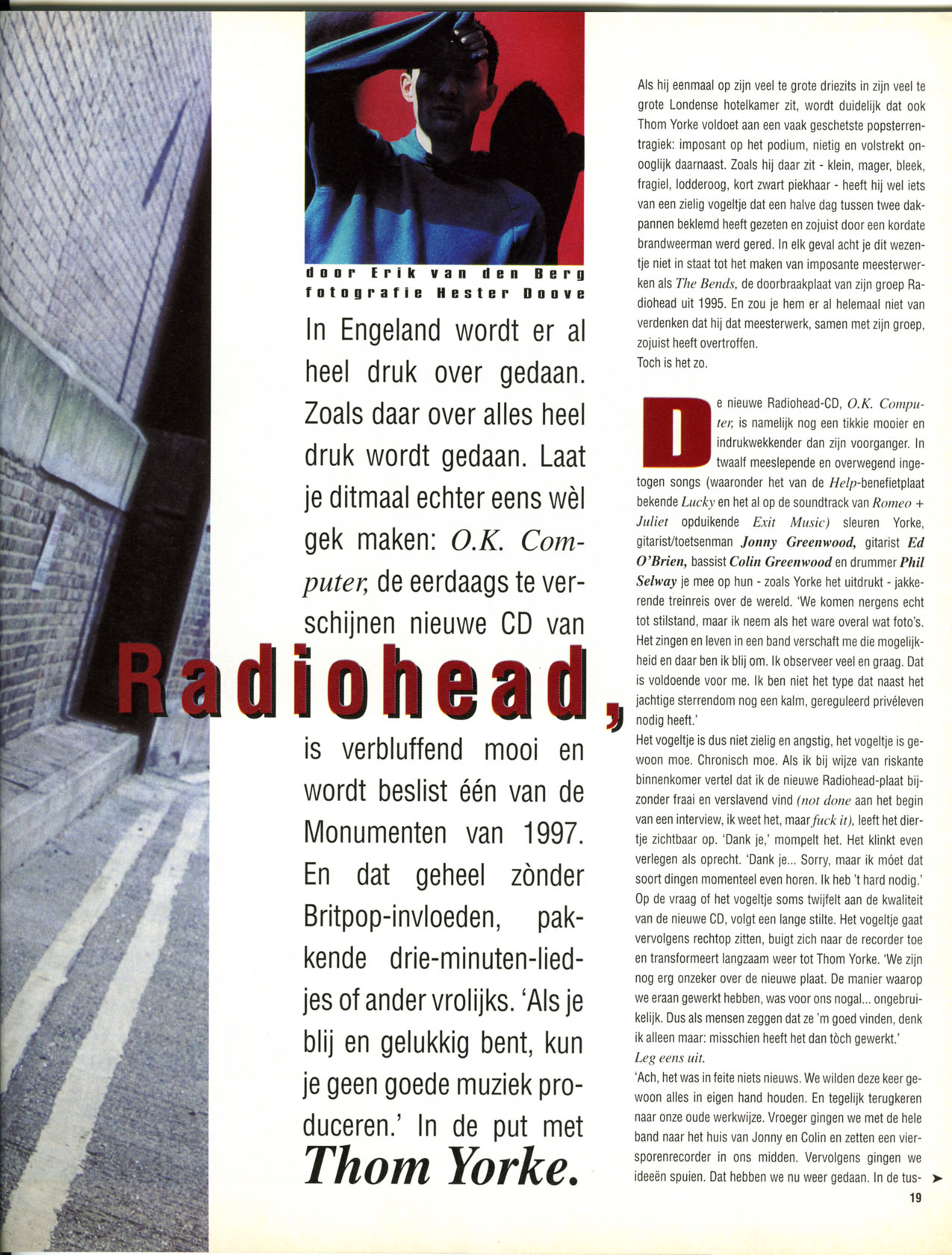Als hij eenmaal op zijn veel te grote driezits in zijn veel te grote Londense hotelkamer zit, wordt duidelijk dat ook Thom Yorke voldoet aan een vaak geschetste popsterren-tragiek: imposant op het podium, nietig en volstrekt on-ooglijk daarnaast. Zoals hij daar zit - klein, mager, bleek, fragiel, lodderoog, kort zwart piekhaar - heeft hij wel iets van een zielig vogeltje dat een halve dag tussen twee dak-pannen beklemd heeft gezeten en zojuist door een kordate brandweerman werd gered. In elk geval acht je dit wezen-tje niet in staat tot het maken van imposante meesterwer-ken als The Bends, de doorbraakplaat van zijn groep Ra-diohead uit 1995. En zou je hem er al helemaal niet van verdenken dat hij dat meesterwerk, samen met zijn groep, zojuist heeft overtroffen. Toch is het zo.