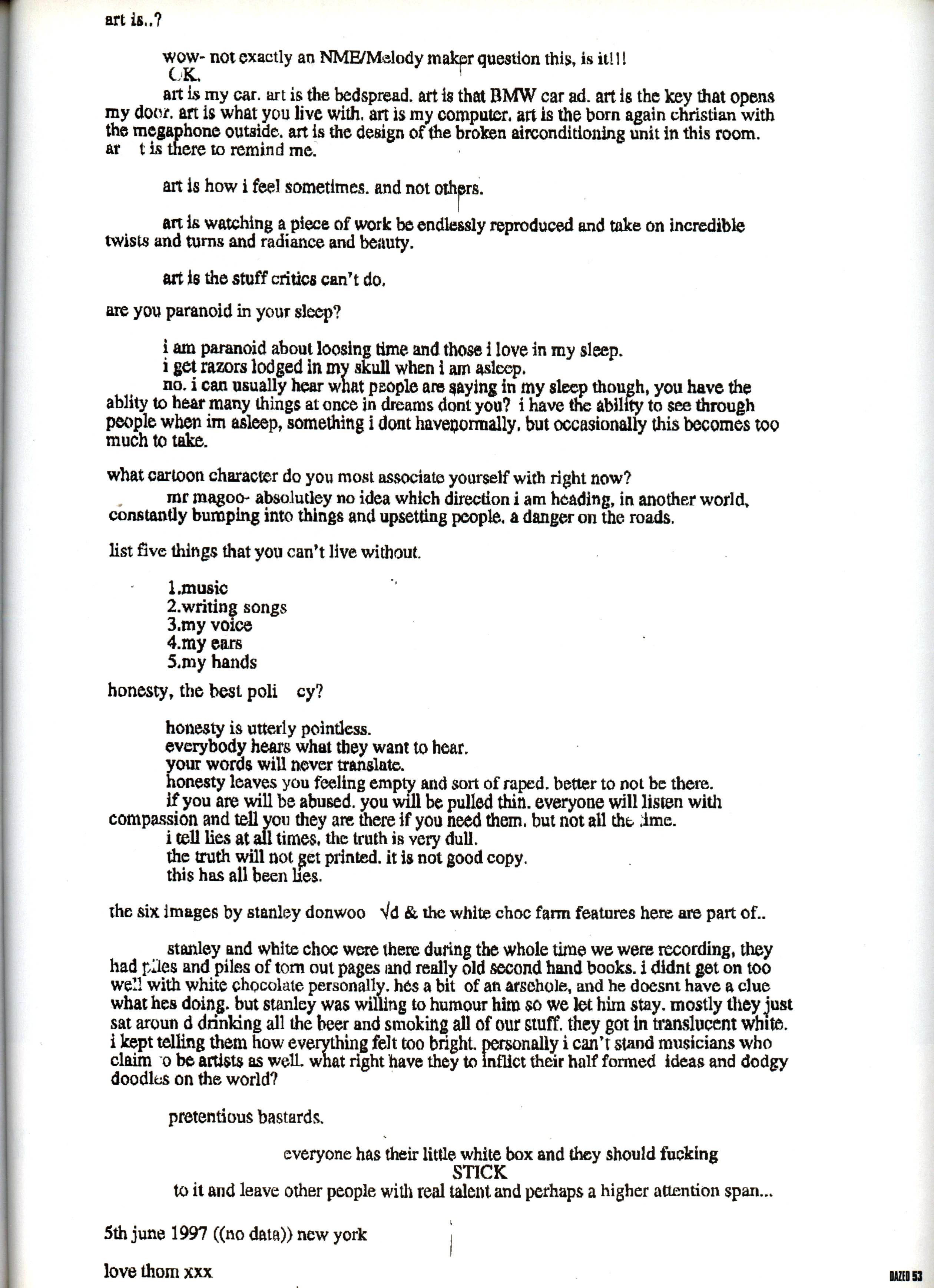 stanley and white choc were there during the whole time we were recording, they had rules and piles of torn out pages and really old second hand books. i didnt get on too well with white chocolate personally. hes a bit of an arsehole, and he doesnt have a clue what hes doing. but stanley was willing to humour him so we Jet him stay. mostly they just sat aroun d drinking all the beer and smoking all of our stuff. they got in translucent white. i kept telling them how everything felt too bright. personally i can't stand musicians who claim to be artists as well. what right have they to inflict their half formed ideas and dodgy doodles on the world?