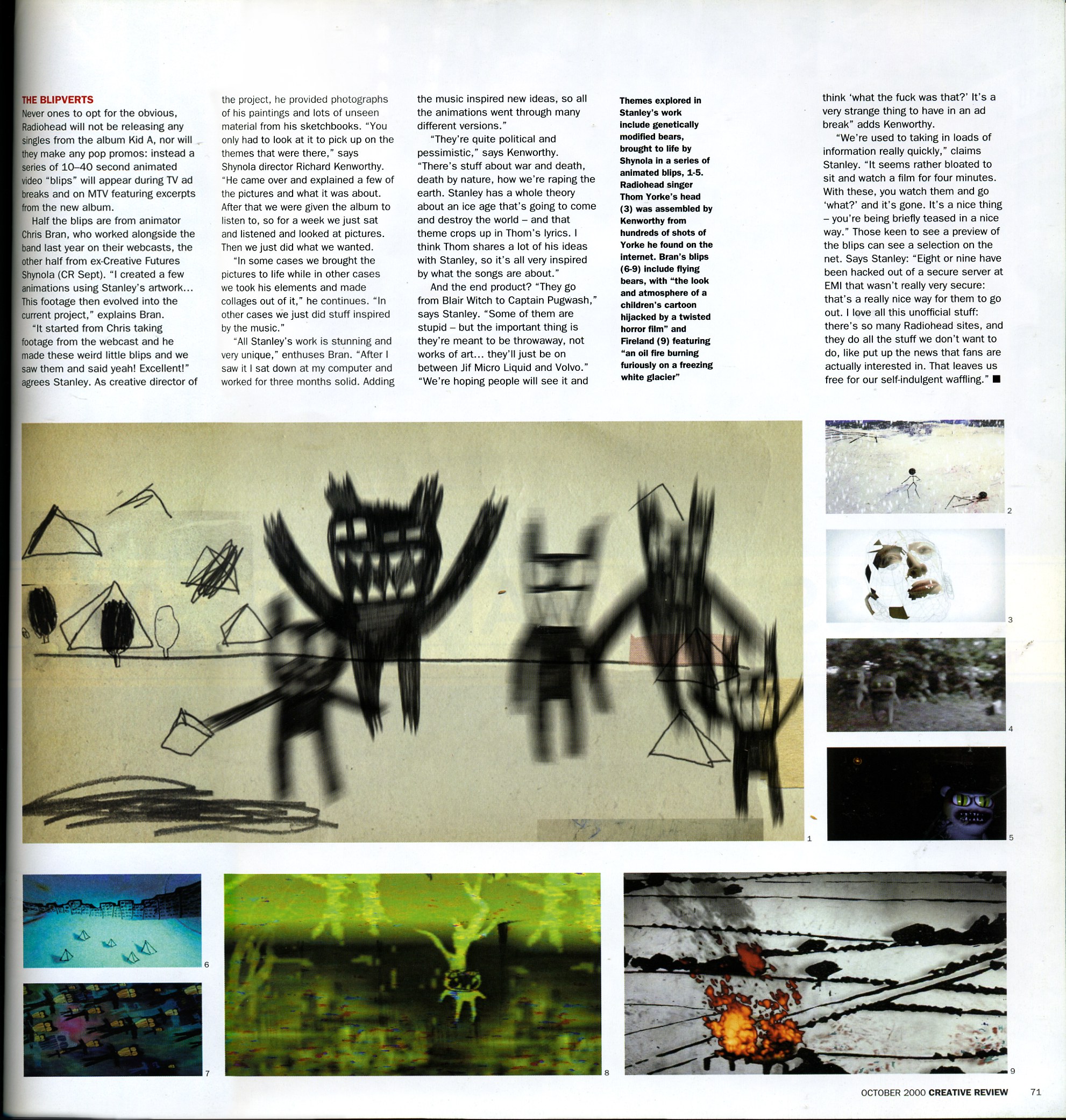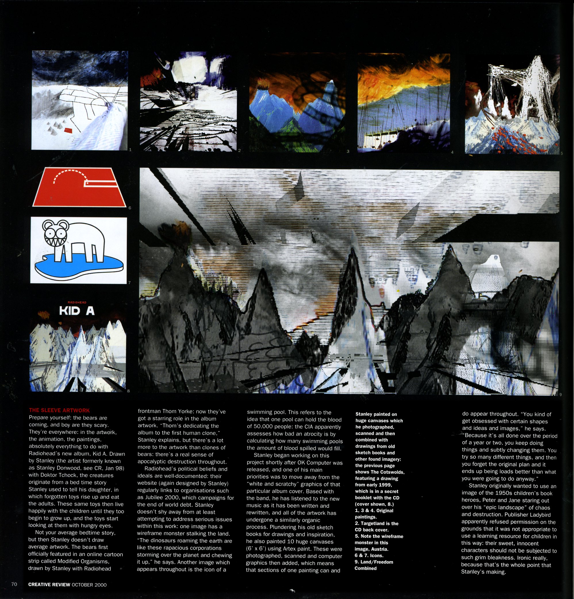 For Radiohead's OK Computer album, resident artist Stanley Donwood created some of the most original music graphics of the 90s. Now known just as Stanley, and with the help of Doktor Tchock and animators Shyndla and Chris Bran, he's gone even further for the band's new release. Paula Carson and Helen Walters have this exclusive preview of the Kid A artwork.