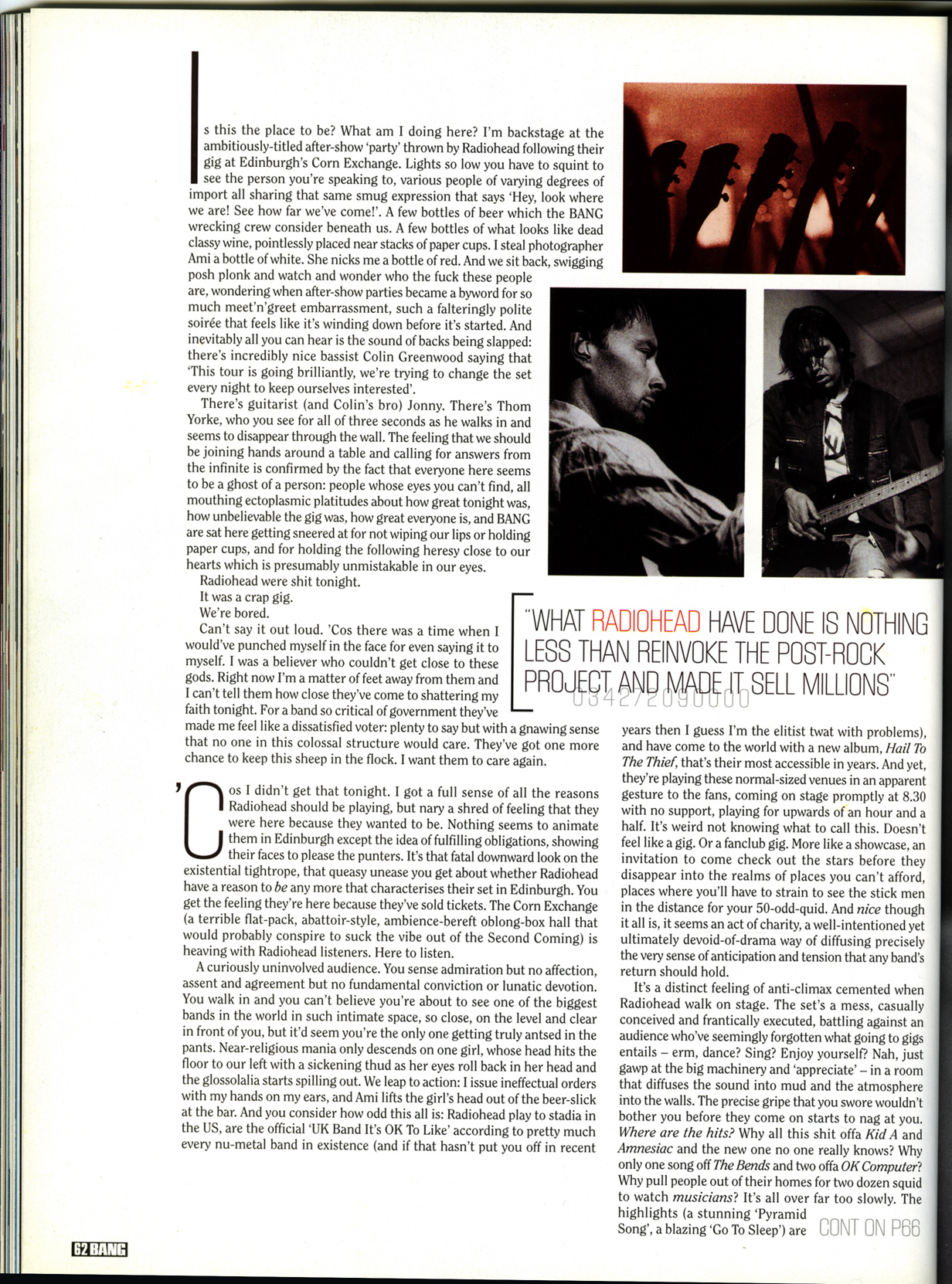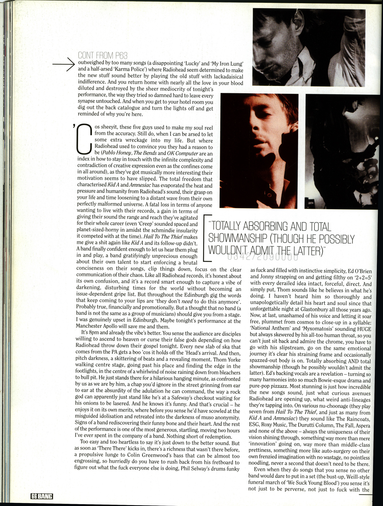 ‘Cos sheeyit. these five guys used to make my soul reel from the accuracy. Still do, when I can be arsed to let some extra wreckage into my life. But where Radiohead used to convince you they had a reason to be (Pablo Honey, The Bends and OK Computer are an index in how to stay in touch with the infinite complexity and contradiction of creative expression even as the confines come in all around), as they’ve got musically more interesting their motivation seems to have slipped. The total freedom that characterised Kid A and Amnesiac has evaporated the heat and pressure and humanity from Radiohead’s sound, their grasp on your life and time loosening to a distant wave from their own perfectly malformed universe. A fatal loss in terms of anyone wanting to live with their records, a gain in terms of giving their sound the range and reach they’ve agitated for their whole career (even ‘Creep’ sounded spaced and planet-sized-horny in amidst the schmindie insularity it competed with at the time). Hail To The Thief makes me give a shit again like Kid A and its follow-up didn’t. A band finally confident enough to let us hear them plug in and play, a band gratifyingly unprecious enough about their own talent to start enforcing a brutal consciousness on their songs, clip things down, focus on the clear communication of their chaos. Like all Radiohead records, it’s honest about its own confusion, and it’s a record smart enough to capture a vibe of darkening, disturbing times for the world without becoming an issue-dependent gripe list. But throughout the Edinburgh gig the words that keep coming to your lips are ‘they don’t need to do this anymore’. Probably true, financially and promotionally. But a thought that no band (a band is not the same as a group of musicians) should give you from a stage, I was genuinely upset in Edinburgh. Maybe tonight’s performance at the Manchester Apollo will save me and them.