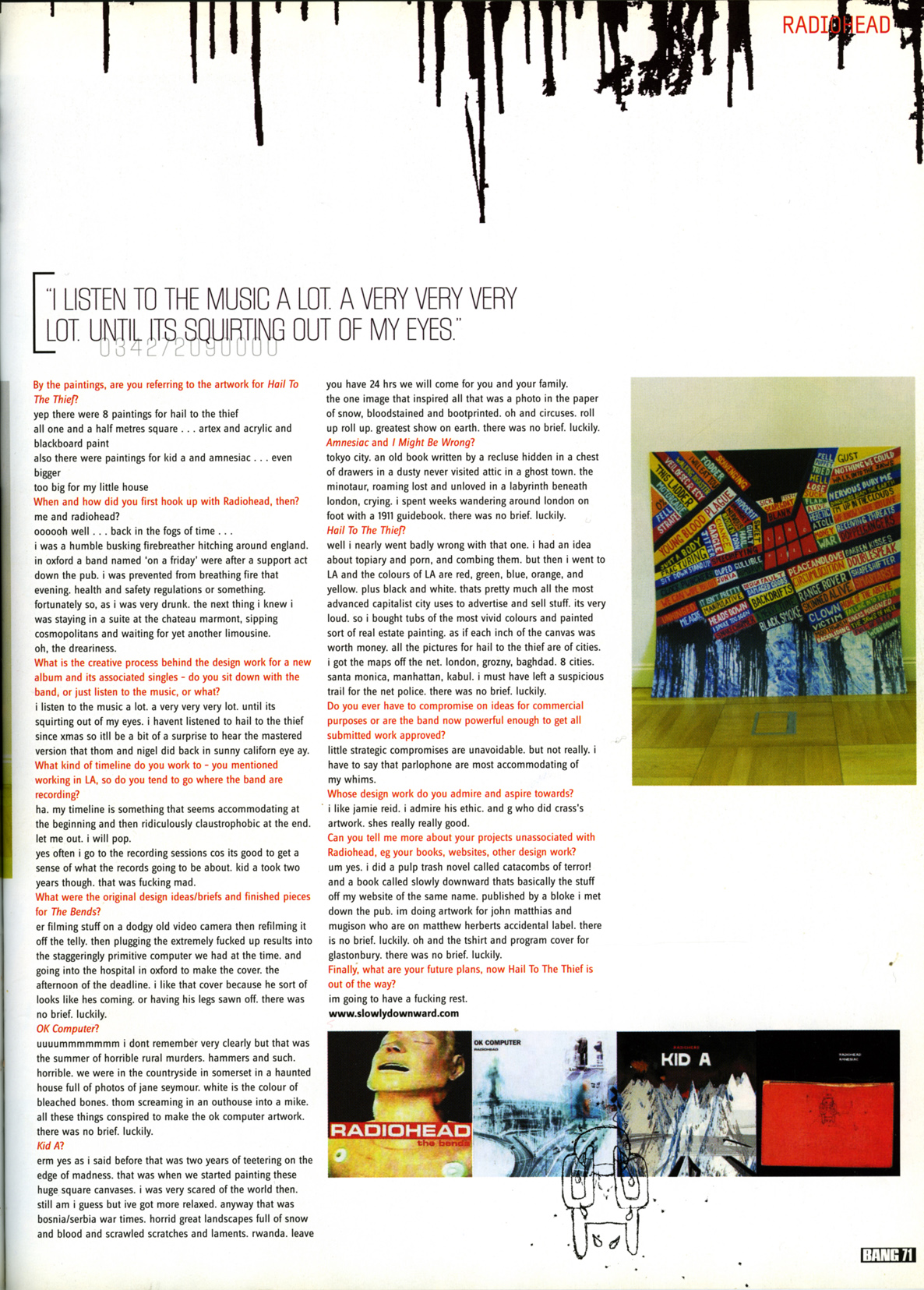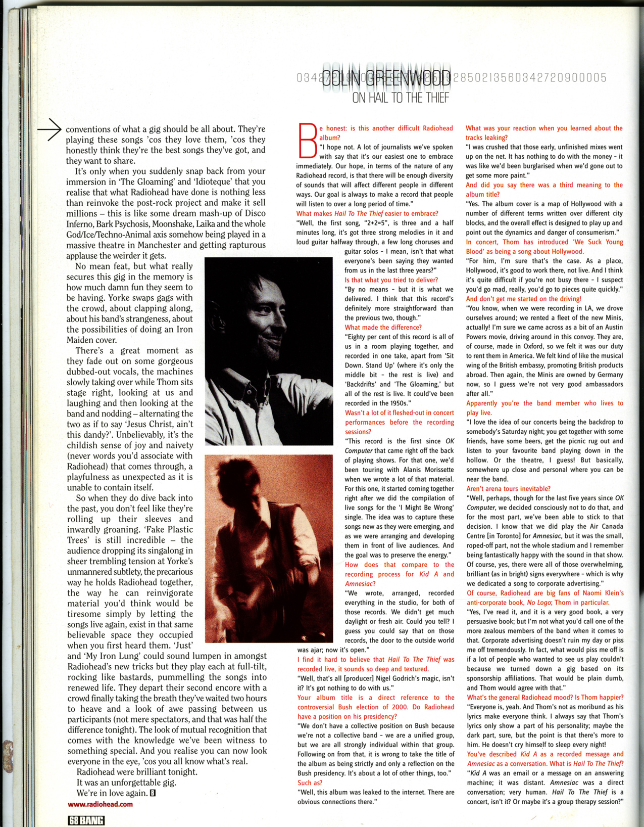 “Kid A was an email or a message on an answering machine; it was distant. Amnesiac was a direct conversation; very human. Hail To The Thief is a concert, isn’t it? Or maybe it’s a group therapy session?”