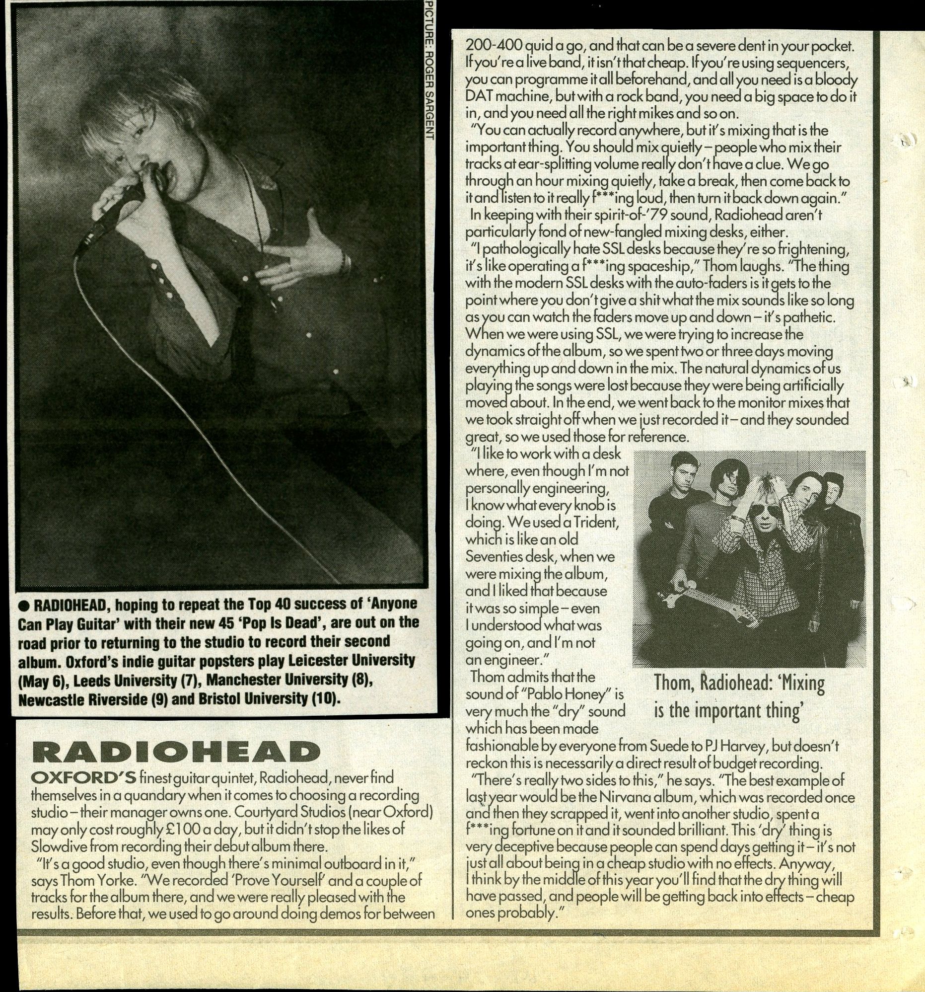"It's a good studio, even though there's minimal outboard in it," says Thom Yorke. "We recorded ’Prove Yourself’ and a couple of tracks tor the album there, and we were really pleased with the results. Before that, we used to go around doing demos for between £200-400 quid a go, and that can be a severe dent in your pocket. If you're a live band, it isn't that cheap. If you're using sequencers, you can programme it all beforehand, and all you need is a bloody DAT machine, but with a rock band, you need a big space to do it in, and you need all the right mikes and so on.