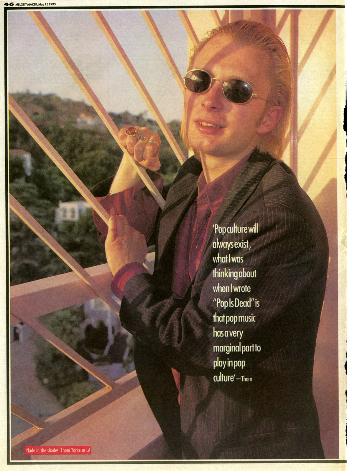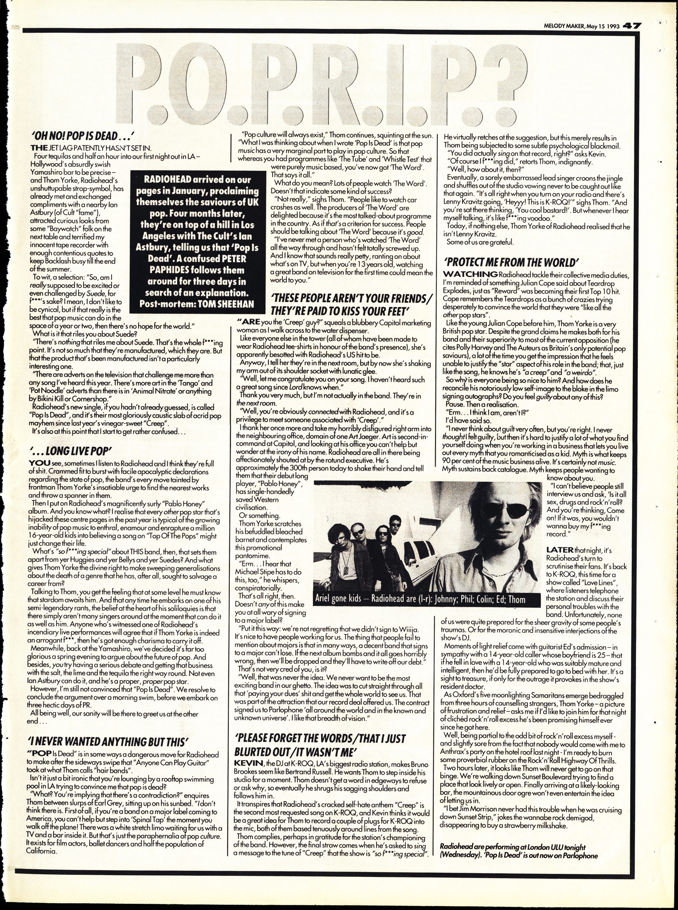 "Pop culture will always exist," Thom continues, squinting at the sun. "What I was thinking about when I wrote ’Pop Is Dead’ is tact pop music has a very marginal part to plan in pop culture. So that whereas you had programmes like 'The Tube’ and 'Whistle Test’ that were purely music based, you've now got 'The Word’. That says it all."
