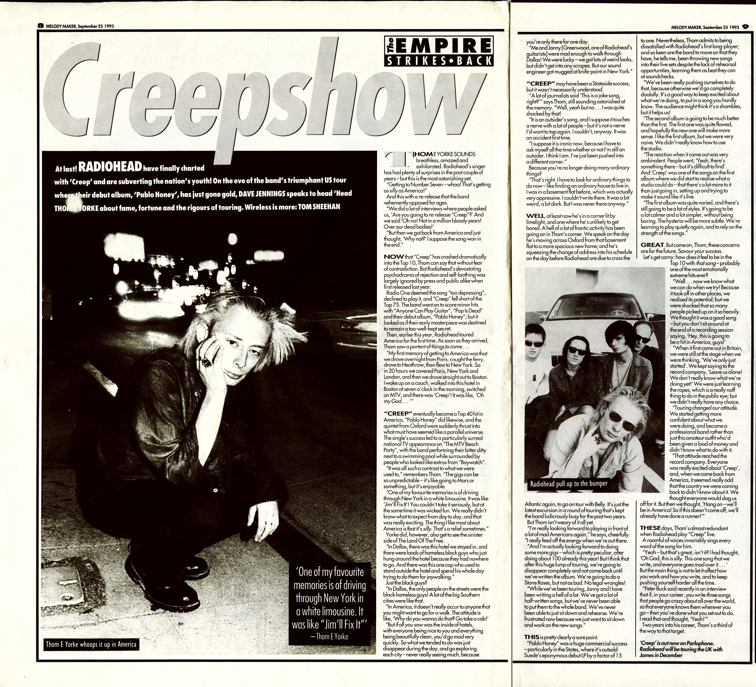 At last! Radiohead have finally charted with 'Creep' and are subverting the nation's youth! On th eve of the band's triumphant US tour where their debut album, 'Pablo Honey', has just gone gold, Dave Jennings speaks to head 'Head Thom Yorke about fame, fortune and the rigours of touring. Wireless is more: Tom Sheehan