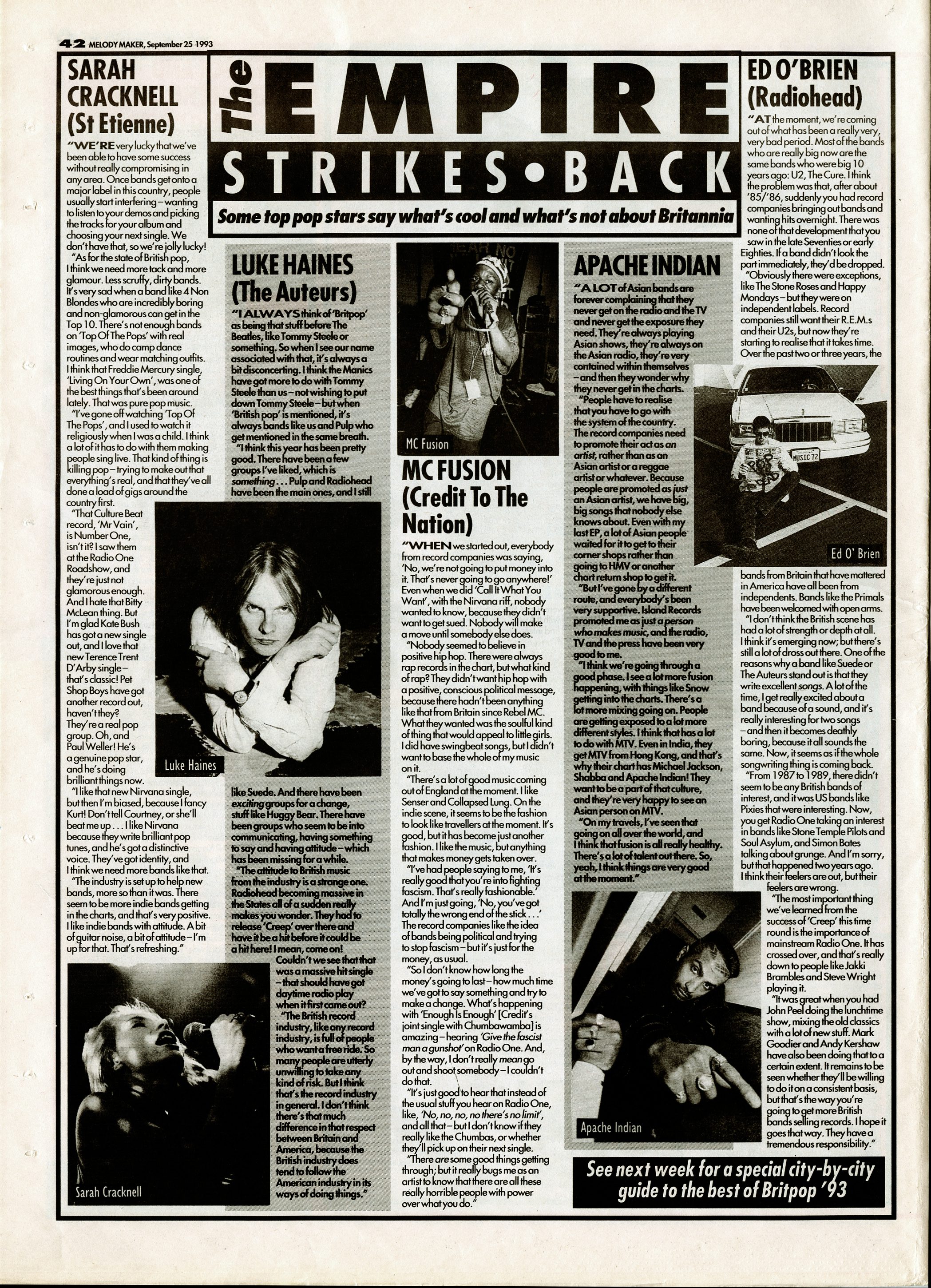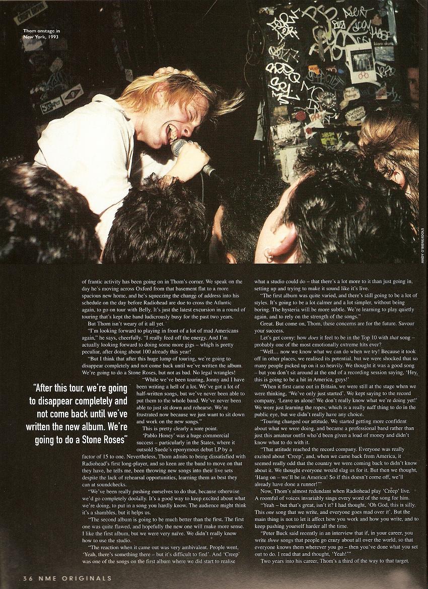 "Pablo Honey" was a huge commercial success - particularly in the States, where it's outsold Suede's eponymous debut LP by a factor of 15 to one. Nevertheless, Thom admits to being dissatisfied with Radiohead's first long-player; and so keen are the band to move on that they have, he tells me, been throwing new songs into their live sets despite the lack of rehearsal opportunities, learning them as best they can at soundchecks.