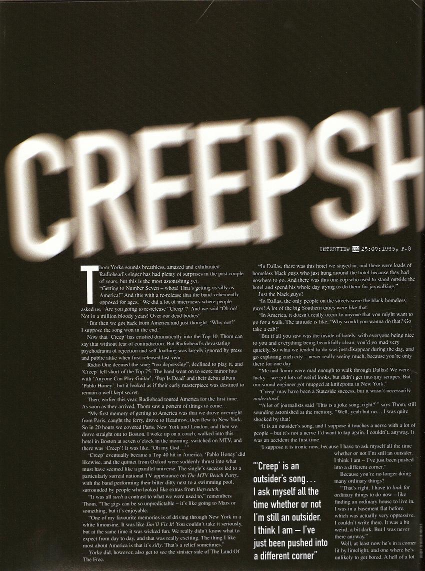 NOW that 'Creep' has crashed dramatically into the Top 10, Thom can say that without fear of contradiction. But Radiohead's devastating psychodrama of rejection and self-loathing was largely ignored by press and public alike when first released last year.