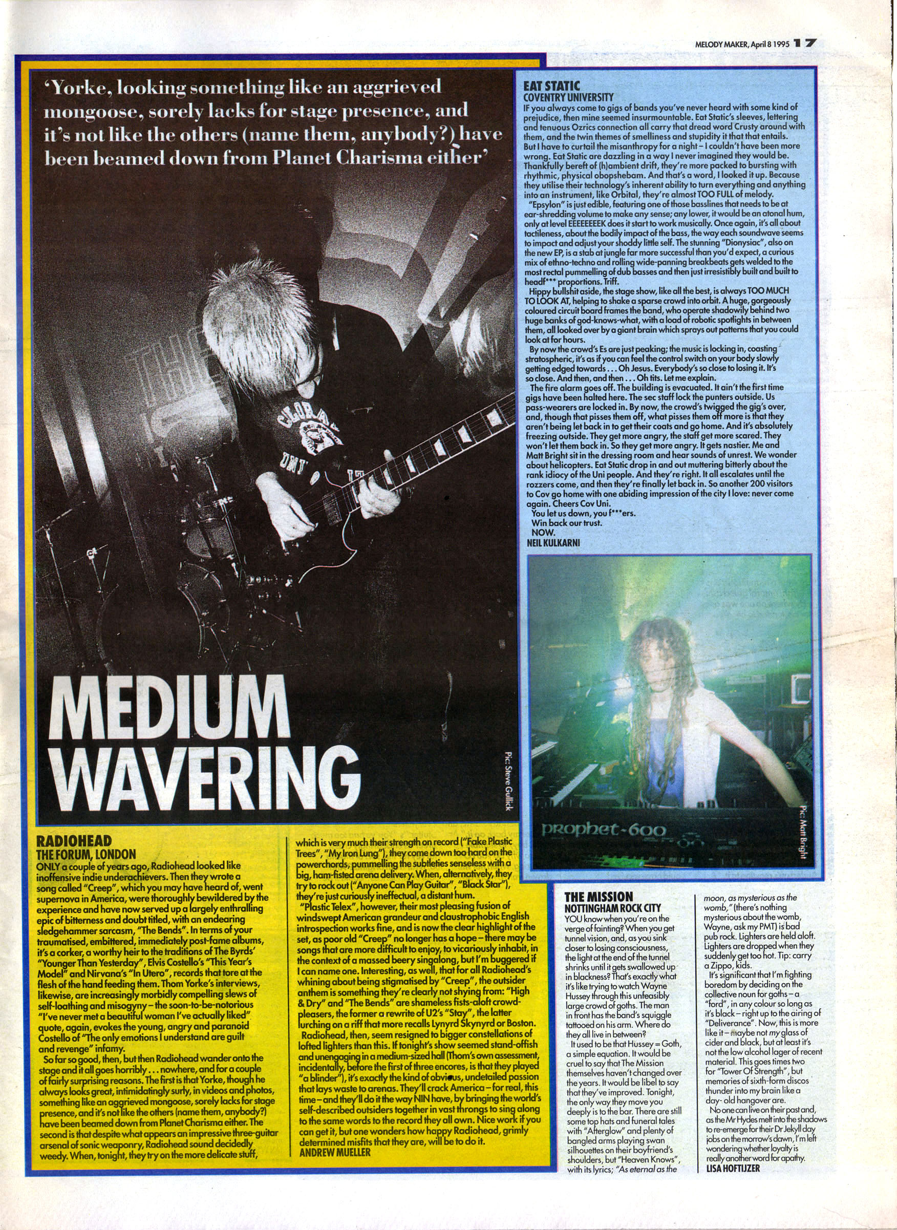So far so good, then, but then Radiohead wander onto the stage and it all goes horribly... nowhere, and for a couple of fairly surprising reasons. The first is that Yorke, although he always looks great, intimidatingly surly, in videos and photos, something like an aggrieved mongoose, sorely lacks for stage presence, and it's not like the others (name them, anybody?) have been beamed down from Planet Charisma either. The second is that despite what appears an impressive three-guitar arsenal of sonic weaponry, Radiohead sound decidedly weedy. When, tonight, they try on the more delicate stuff, which is very much their strength on records (“Fake Plastic Trees”, “My Iron Lung”) they come down too hard on the powerchords, pummelling the subtleties senseless with a big, ham-fisted arena delivery. When, alternatively, they try to rock out (“Anyone Can Play Guitar”, “Black Star”) they're just curiously ineffectual, a distant hum.