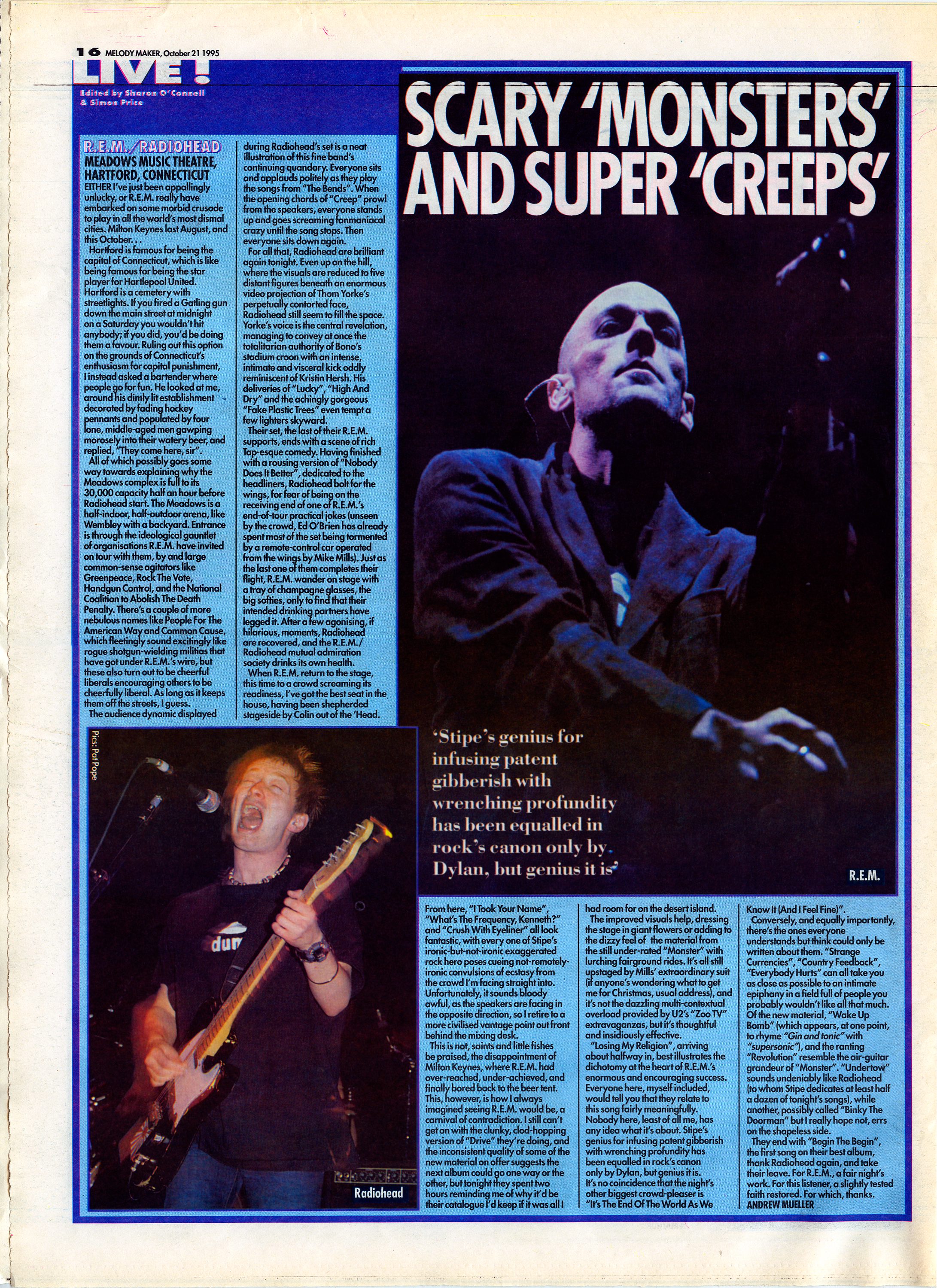 This is not, saints and little fishes be praised, the disappointment of Milton Keynes, where R.E.M. had over-reached, under-achieved, and finally bared back to the beer tent. This, however, is how I always imagined seeing R.E.M. would be, a carnival of contradiction. I still can’t get on with the c1unky, c1od-hopping version of “Drive” they’re doing, and the inconsistent quality of some of the new material on offer suggests the next album could go one wayor the other, but tonight they spent two hours reminding me of why it’d be their catalogue I’d keep if it was all I had room for on the desert island.