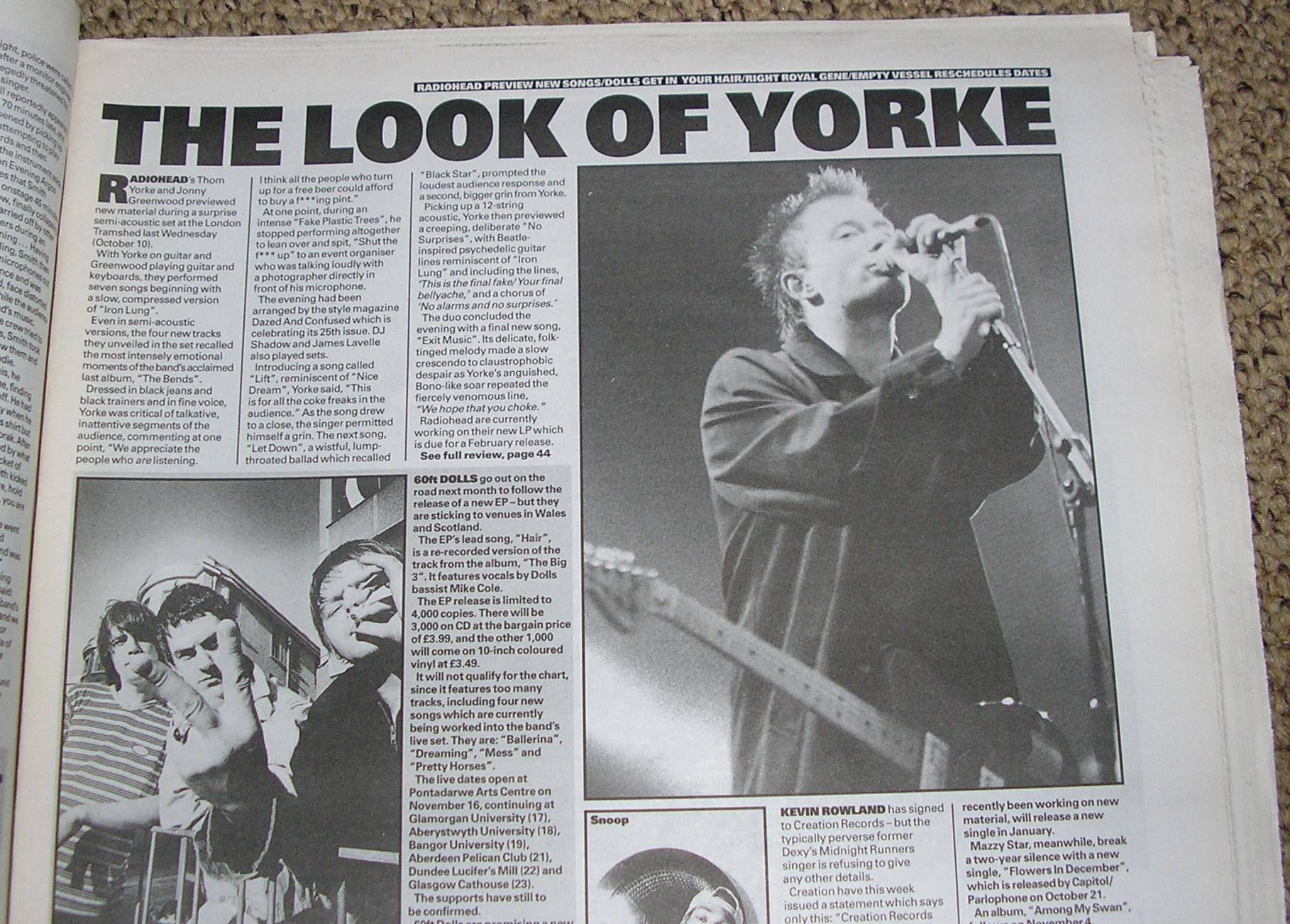 Introducing a song called “Lift”, reminiscent of “Nice Dream”, Yorke said, “This is for all the coke freaks in the audience.” As the song drew to a close, the singer permitted himself a grin. The next song, “Let Down”, a wistful, lump-throated ballad which recalled “Black Star”, prompted the loudest audience response and a second, bigger grin from Yorke.