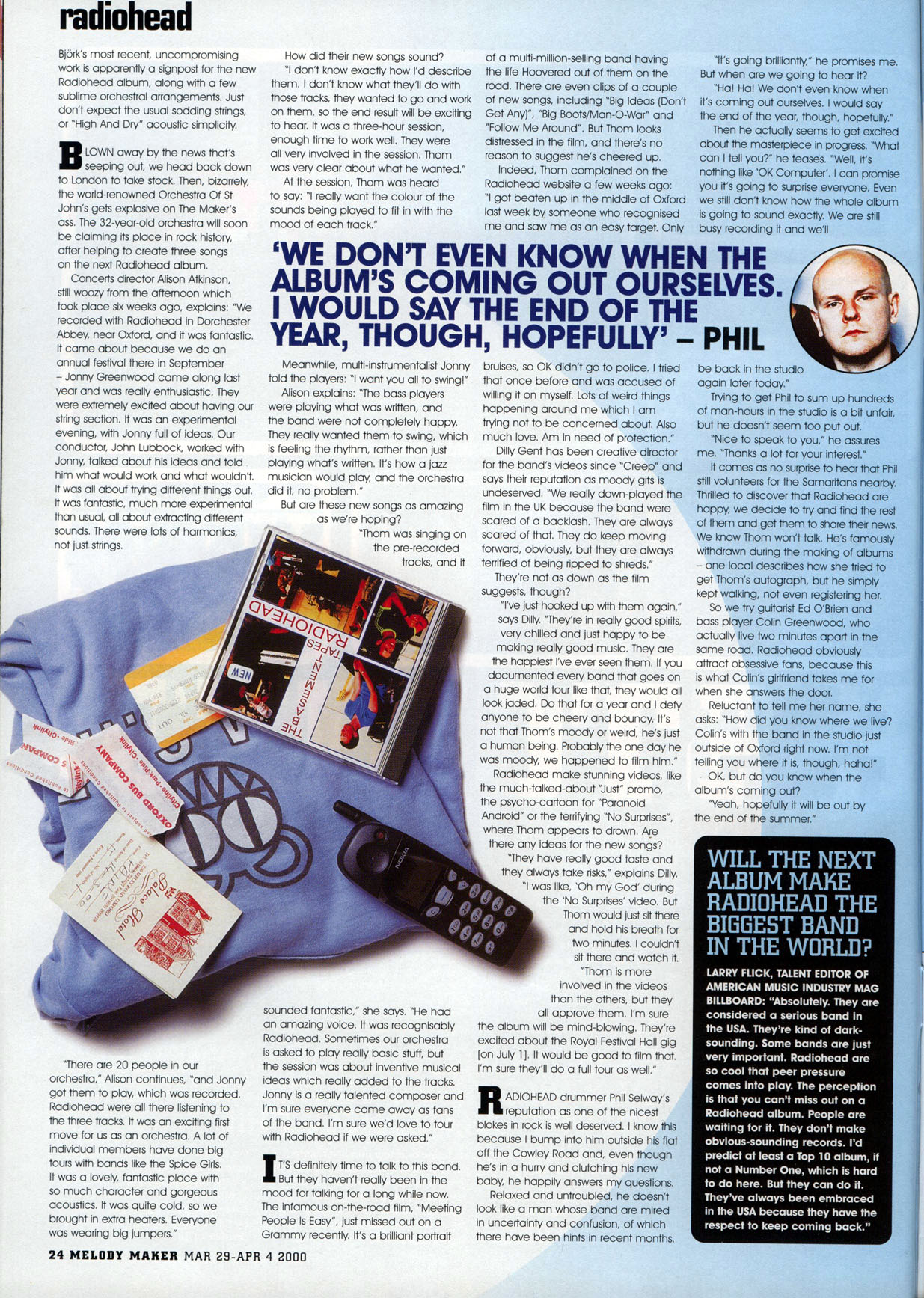 Then he actually seems to get excited about the masterpiece in progress. "What can I tell you?" he teases. "Well, it's nothing like 'OK Computer'. I can promise you it's going to surprises everyone. Even we still don't know how the whole album is going to sound eactly. We are still busy recording it and we'll be back in the studio again later today."